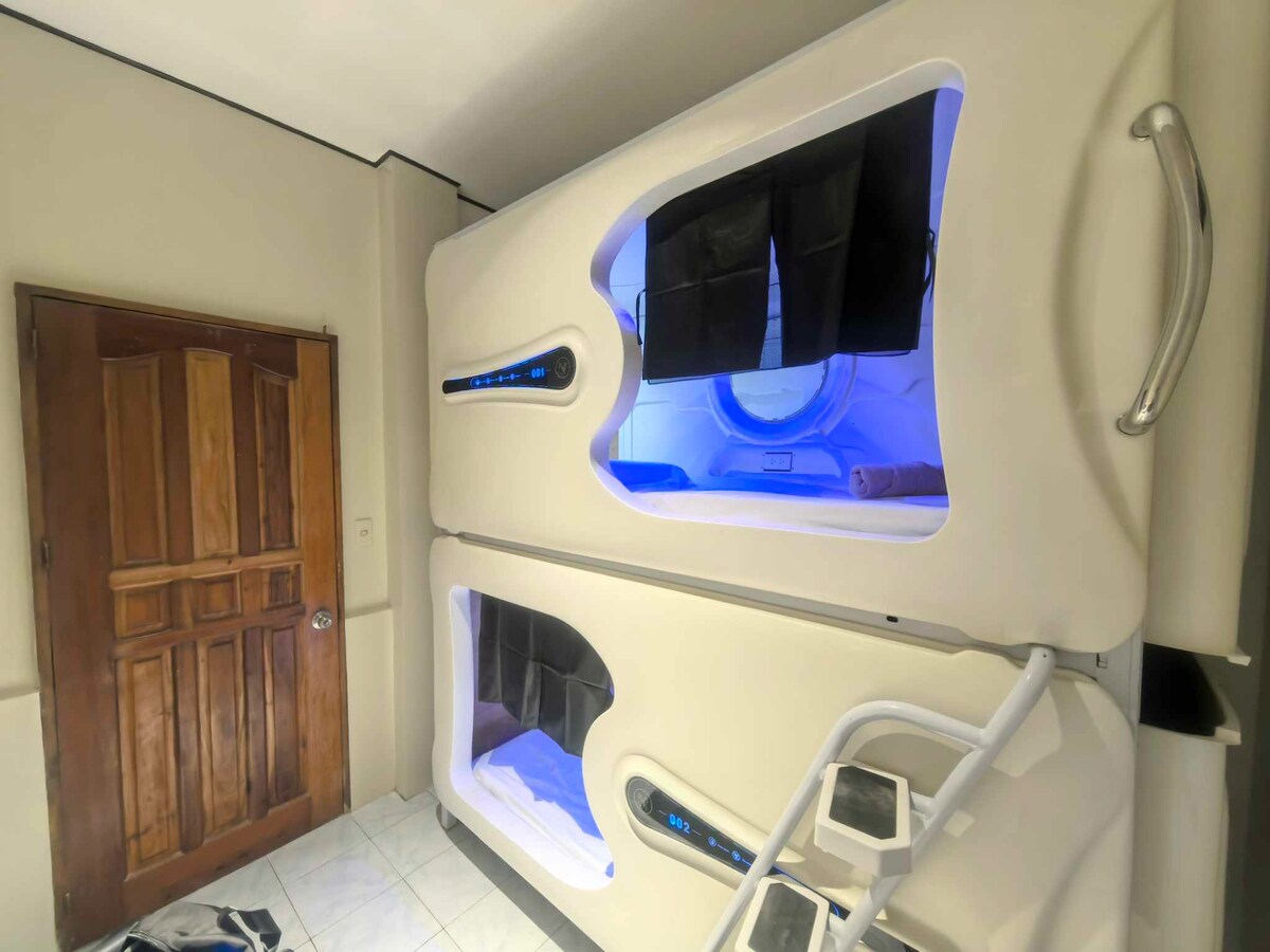 Airconditioned cozy capsule room with just two units, each featuring soft, ambient lighting and for a peaceful escape. Snug mattresses are topped with blankets, and small shelves hold personal items and charging outlets.