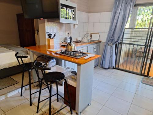 This modern self catering unit is situated in a quiet area yet close to town. It has a queen size bed, spacious walk in shower and a kitchen with a full size fridge. You also have a verandah where you can either relax or sit and work.