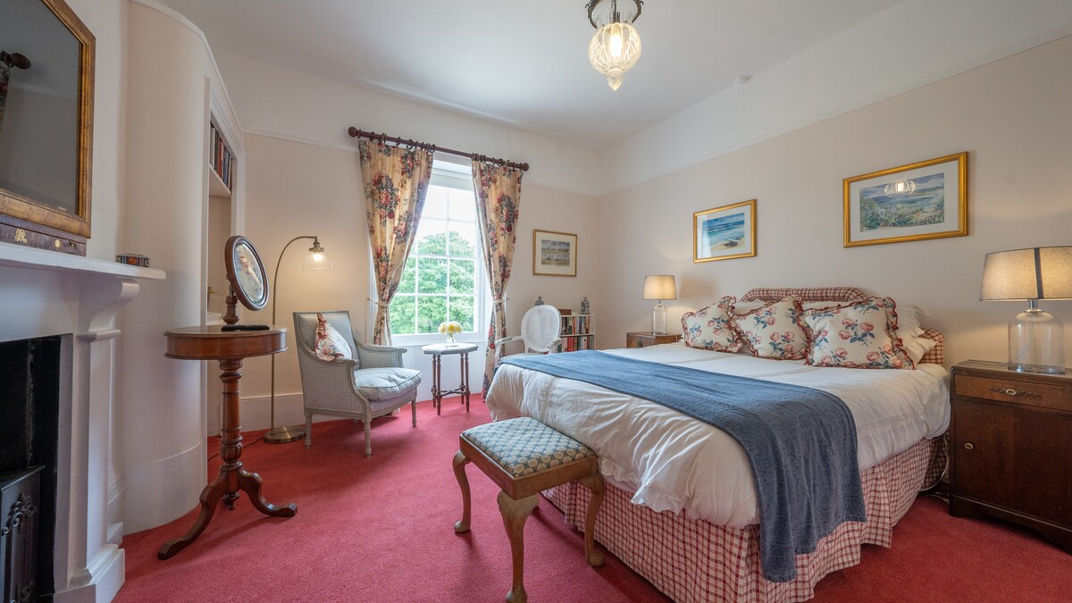 Room 3 - a delightful double room with ensuite bathroom with shower over the bath, overlooking the expansive lawns and flowerbeds of Pantybeiliau
