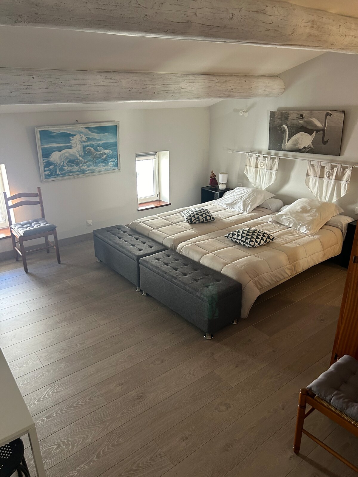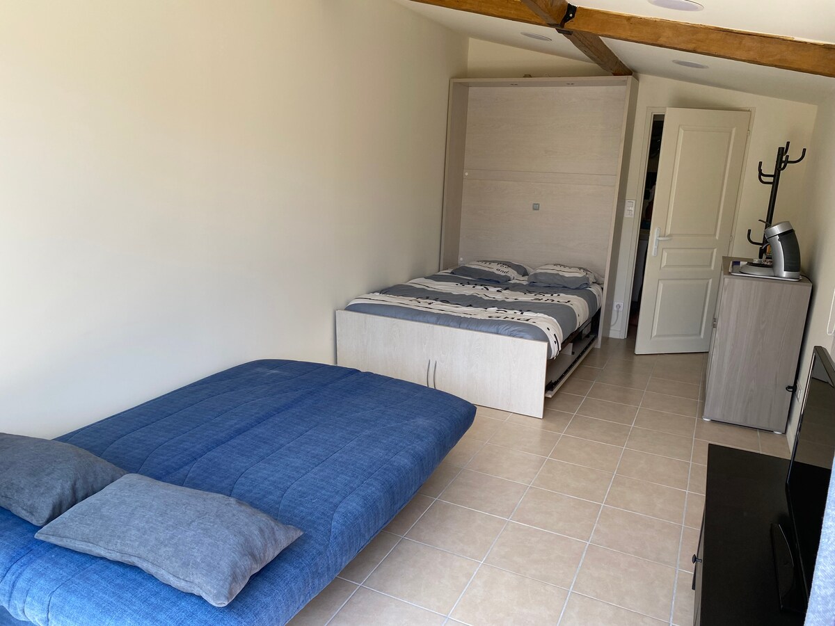 This peaceful accommodation offers a relaxing stay for the family. Various activities in the surroundings (Spirou Park, Wave Island Water Park, Avignon, Isles sur la Sorgues,etc.).A double retractable bed + 1 double bed-clutch.Shower towels provided.TV and coffee machine available.Small table with chairs outside.Absence of kitchenette and dishes. Small fridge recently put inside the lof especially during this period of heat wave. Do not smoke and eat in the loft.