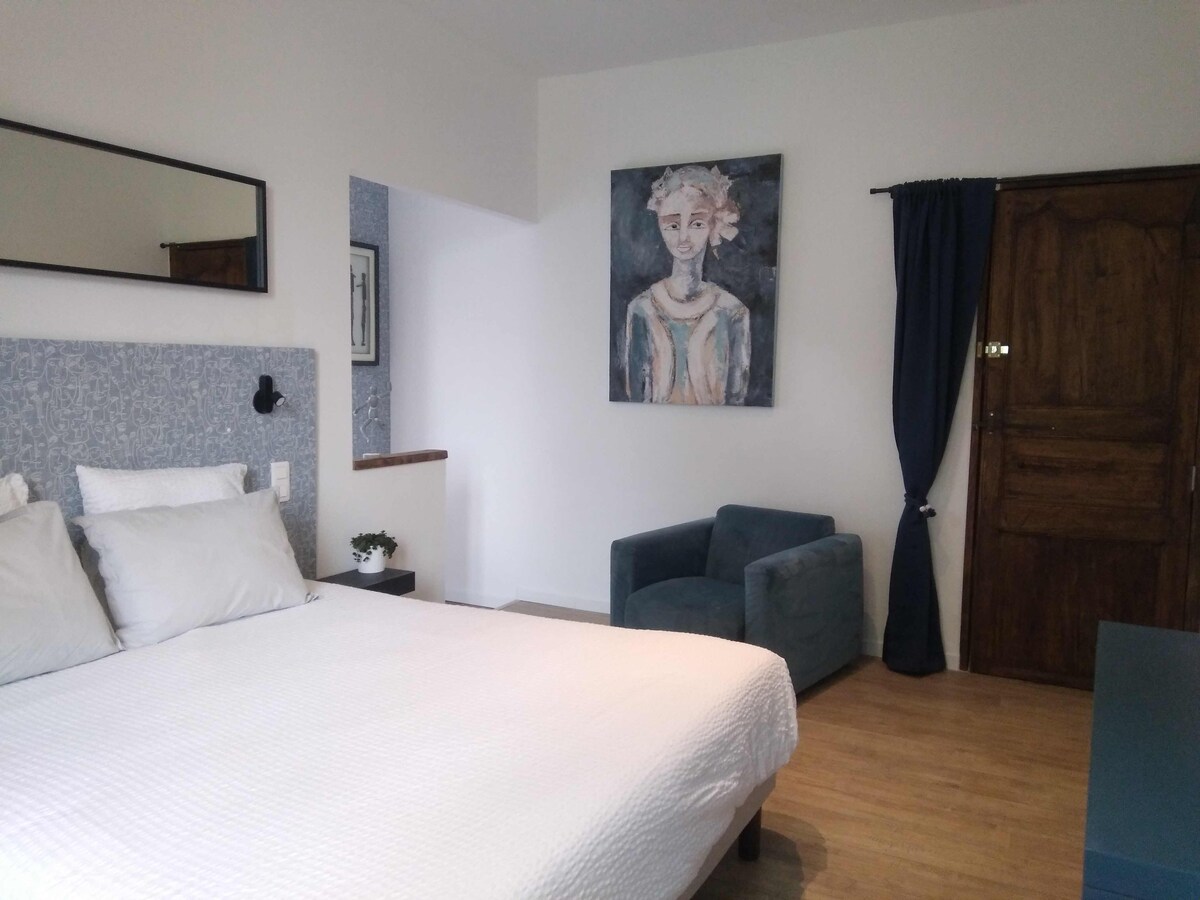 Close to the center of the village, this Art Deco style house will charm you! You will have a bedroom with a bed for two people with air conditioning, and a private bathroom.