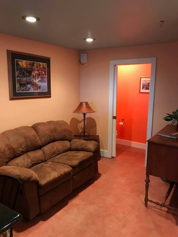 The Guest suite has three rooms, all private but connected to the main house. Walk into the kitchenette from the main entrance where there is a fridge, sink, microwave and bar. There's a private bathroom and bedroom that both lock that connect to the kitchen. Step up into the full brand-new bathroom with step in shower. The bedroom is huge with plenty of space to move around in and spend time. There’s a queen bed, bench and futon that folds out into a twin bed that would fit one teenager or two small children. The tv is in the bedroom.