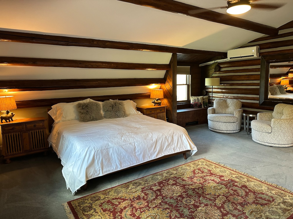 The Tempranillo room features a king bed with a private ensuite bathroom. The rustic wooden beams and cozy decor create a warm and welcoming atmosphere, perfect for a relaxing stay. Enjoy comfortable seating, ideal for reading or simply soaking in the tranquil ambiance.