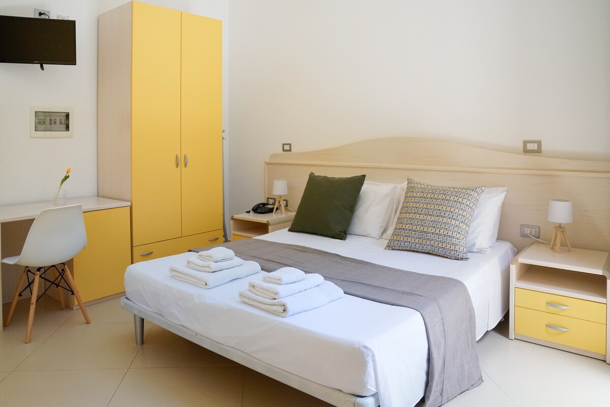 Our room is ideal for a couple looking for intimacy and tranquility. Equipped with a comfortable double bed, air conditioning, free Wi-Fi, private bathroom, flat-screen TV, minibar, it offers everything you need for a relaxing and independent stay.