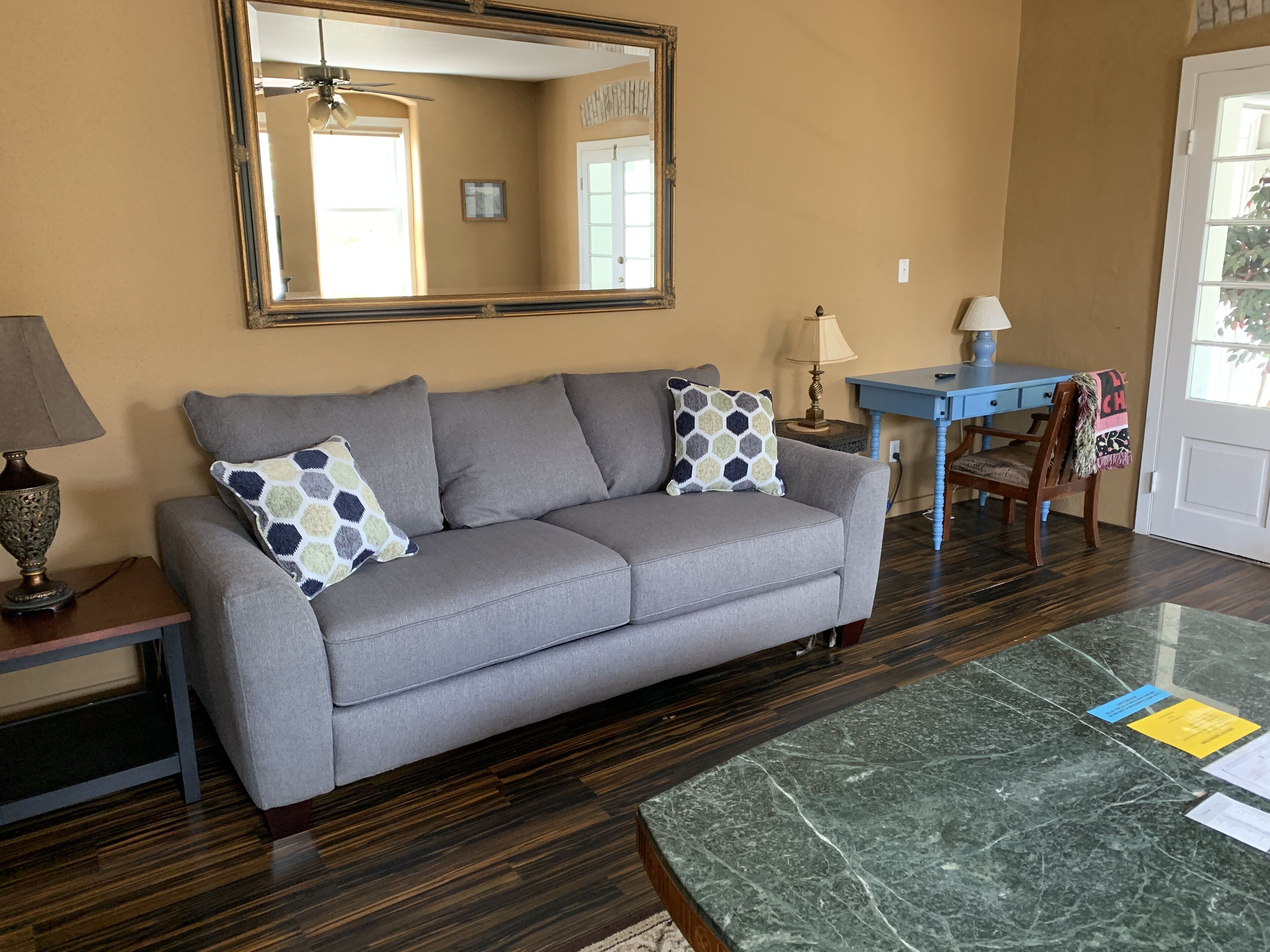 The Guest house at Blue Water is a 1 bedroom 1 bath studio style space. Complete with a sitting area and a full kitchen. Easily sleeps 2 adults and 2 kids on the pull out couch.
