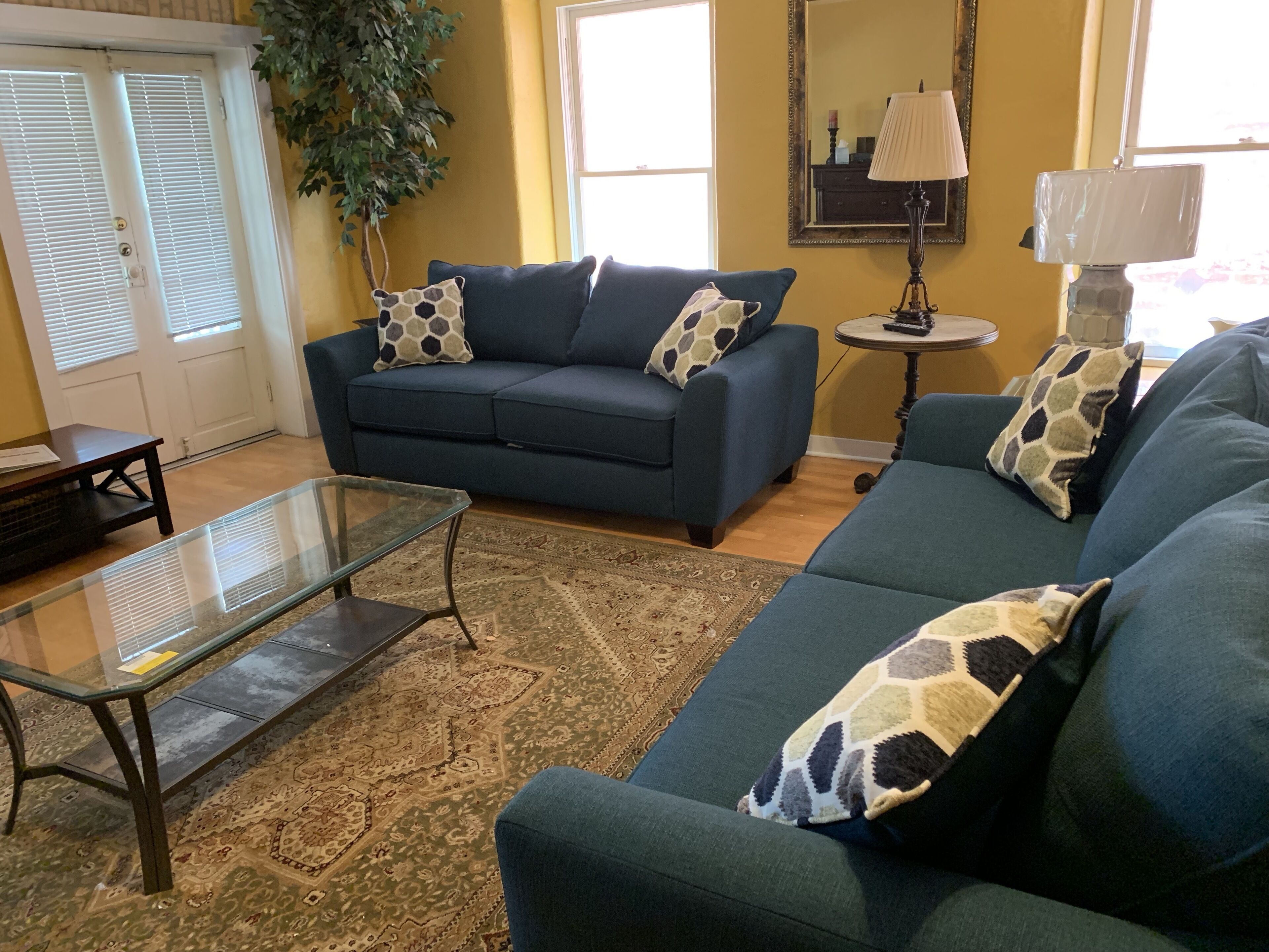 The main suite living area includes a queen-size tempur-pedic bed, a queen-size pull-out couch, and an area for an additional blow-up mattress (a twin blow up mattress is also included for your convenience). The 55 inch flat screen smart capability TV can be viewed from most angles within the suite. Want to finish that video or TV show you started, simply sign into your account and catch up!