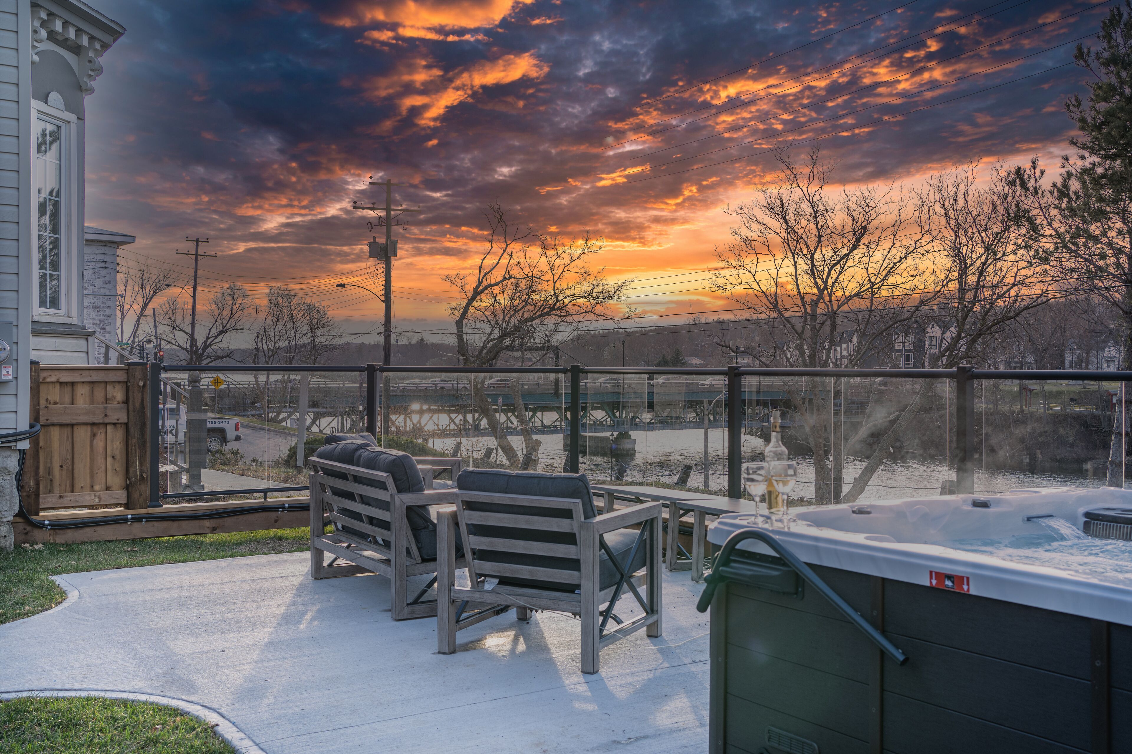 Beyond the unit the guest has rented, they will have access to a full kitchen on the 2nd floor as well as an indoor Infared Sauna & and a shared outdoor leisure area. The outdoor area includes a 6-person hot tub, a gazebo, a fire pit and several seats overlooking the East River. Beautifully lit by strung Edison bulbs at night to set a perfect calming atmosphere. Building has EV charging port that is available, at a small cost to guests with EVs.