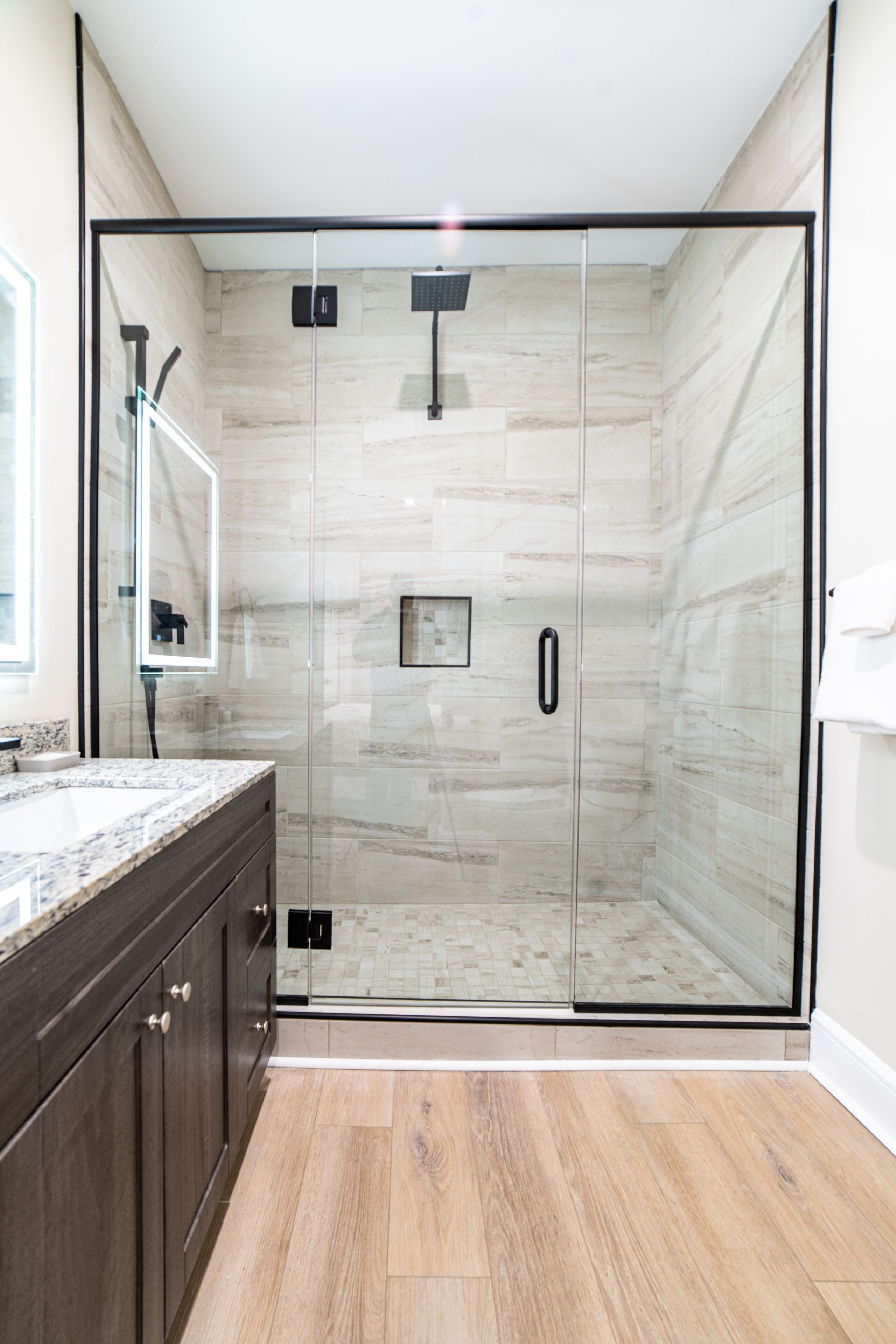 Unit 4 - within the historic Riverside Inn. Spacious bedroom with sitting table, TV, mini fridge, coffee maker & smart TV with views of the East River. Modern high-end bathroom sure to impress including a beautiful custom glass and tile shower. Spacious bedroom with queen size bed and TV. Unit has individually controlled AC units.