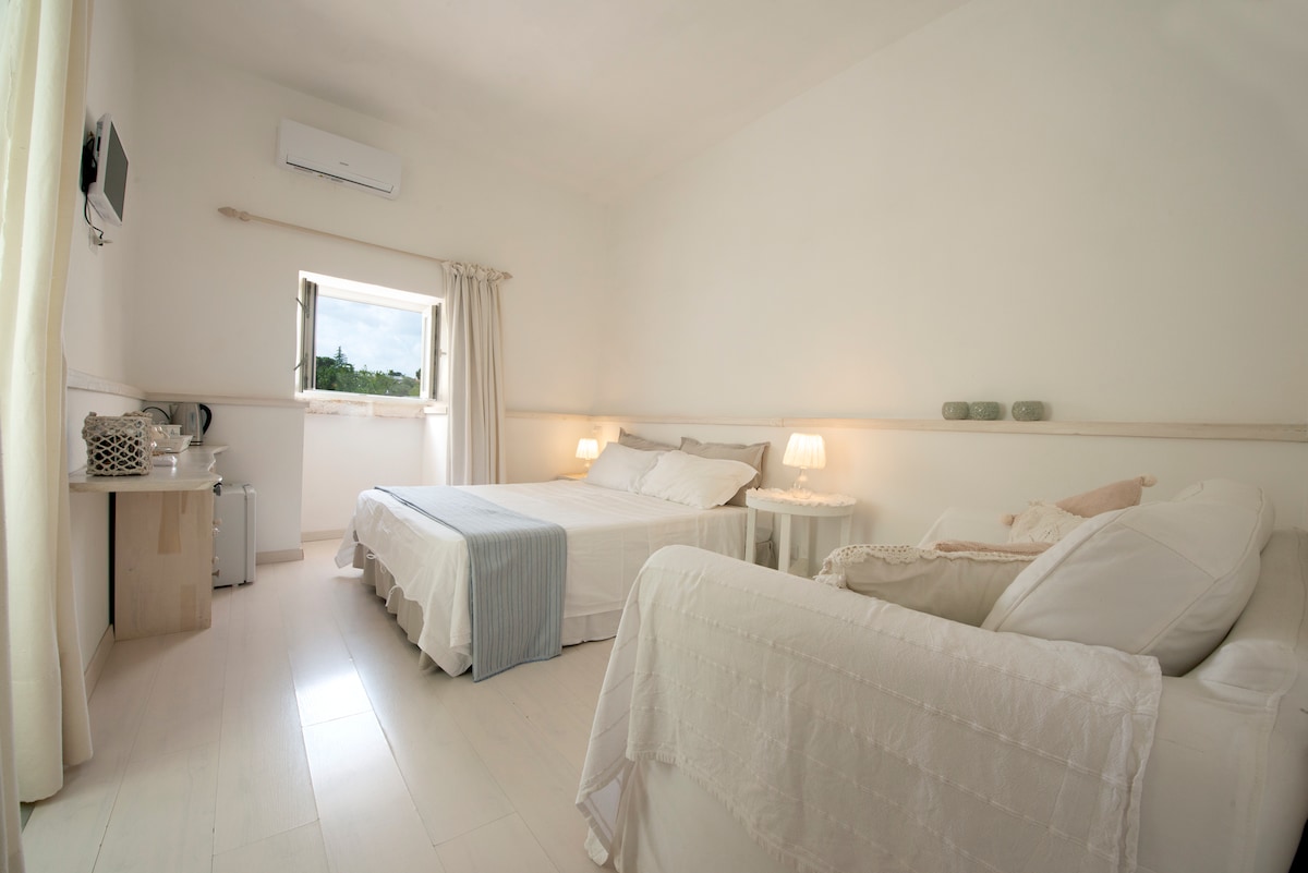 A double room in a typical Apulian TRULLO a conical structure made of stone. The room has two trulli, two cones, inside the first one there is a double bed and in the otherone there are bathroom, wardrobe and a small sofa (extra bed for children)