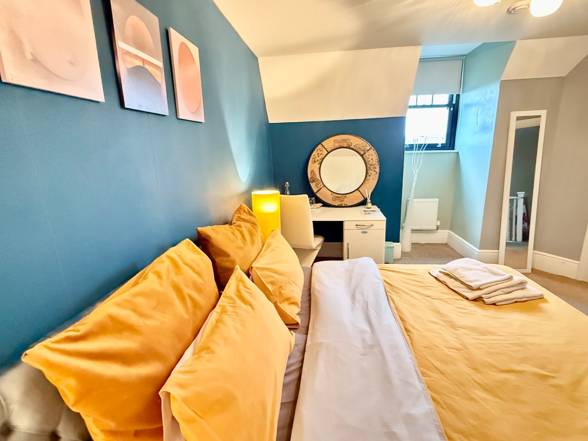 Featuring a luxurious king-sized bed, ample wardrobe space, a dedicated workspace with a desk and office chair, and ultra-fast WiFi.