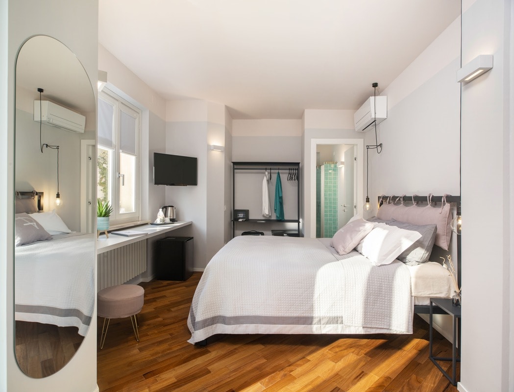 Inside you will find a double bed with nightstands, a comfortable walk-in closet to store your belongings, and a Smart TV with Netflix and Amazon Prime Video, perfect for your moments of relaxation. The room is also equipped with an air conditioner to guarantee you maximum comfort even on the hottest days.