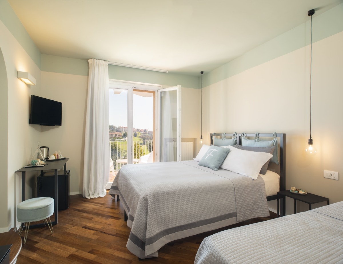 Inside you will find a double bed and a single bed with nightstands, a comfortable walk-in closet to store your personal belongings, and a Smart TV with Netflix and Amazon Prime Video, perfect for your moments of relaxation. The room is also equipped with an air conditioner to guarantee you maximum comfort even on the hottest days.