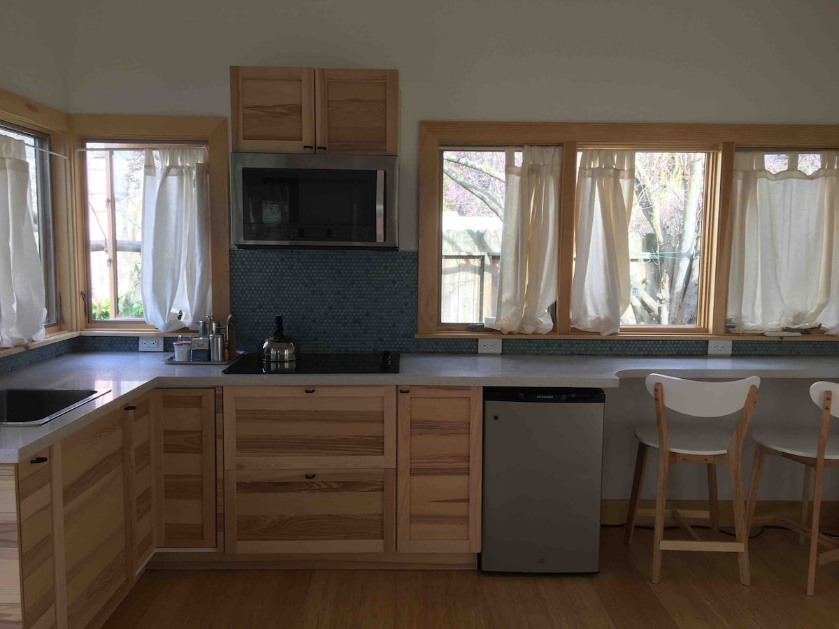 The cottage is newly remodeled as of March 2022 and now has its own kitchen and bathroom. It is a separate unit in my backyard with vaulted ceilings which gives a spacious feel and french doors that open onto the lush garden. Queen size high end natural organic fiber bed (Earthsake.com), with down comforter + 4 pillows. Dining table and stools. LCD TV, clothes valet, work desk and great internet. Its very quiet and my guests seem to love having a private retreat type space to themselves.