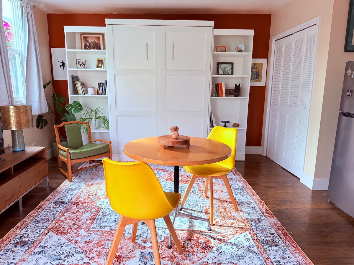 The cottage features a full kitchen, open-concept dining/living area with pull-out bed, 2 bedrooms, 1 full bathroom, and private outdoor patio, perfect for entertaining. One bedroom has a full-size bed and PackNPlay. The other bedroom has a twin bed, desk and chair. Wi-Fi, Roku TV, DVD collection, and espresso maker included. Free shared laundry on-site. Other than an occasional passing train, the neighborhood is quiet with shopping, dining, entertainment, and transit nearby.