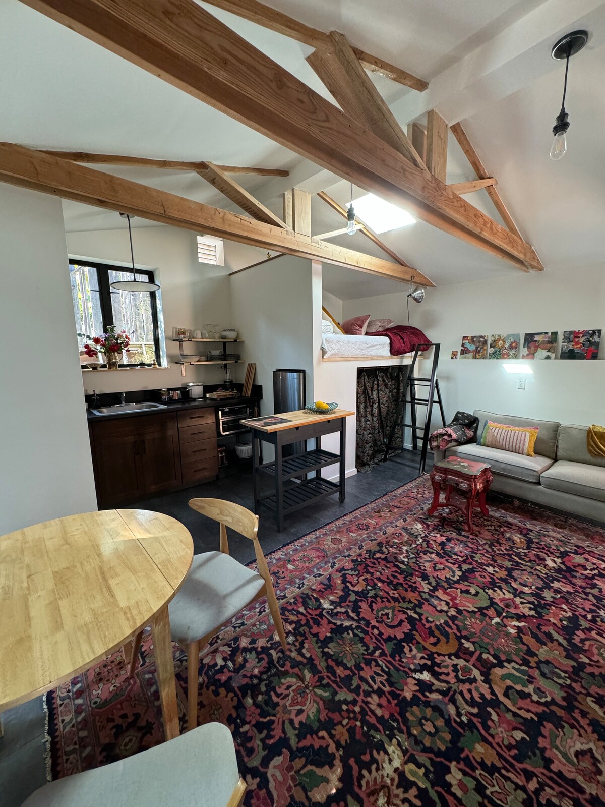 Guests access the cottage via the backyard through your own entrance. Feel free to chill in the adirondack chairs, hammock, or tiny treehouse! The space is a ~300 sq ft studio, with a comfy queen bed, loveseat, small dining area, and bath. Lots of great light fill the space and the wifi is FAST!