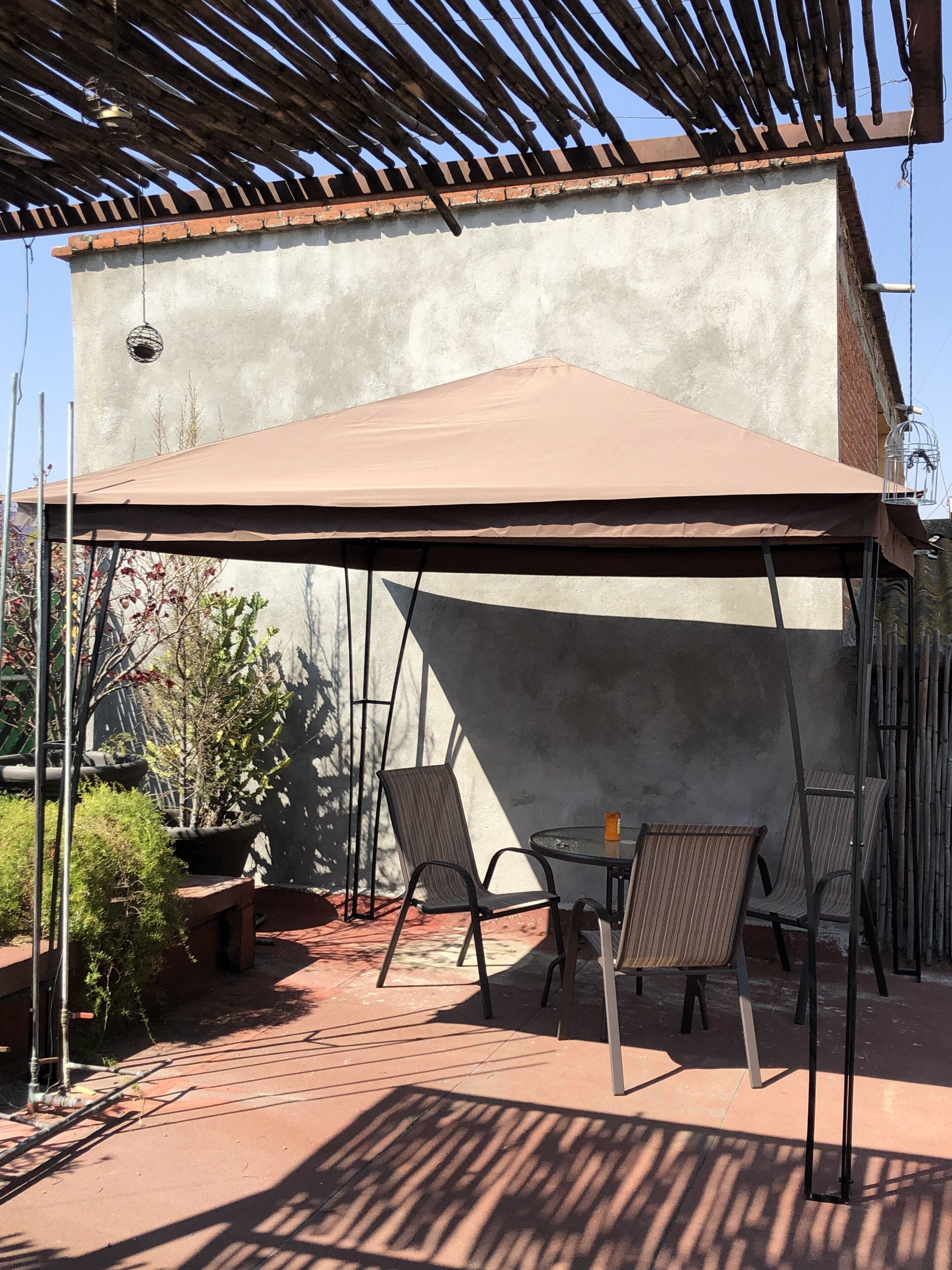 The room is on the ground floor of the house, so you can only access the central patio and the chairs next to the workshop.