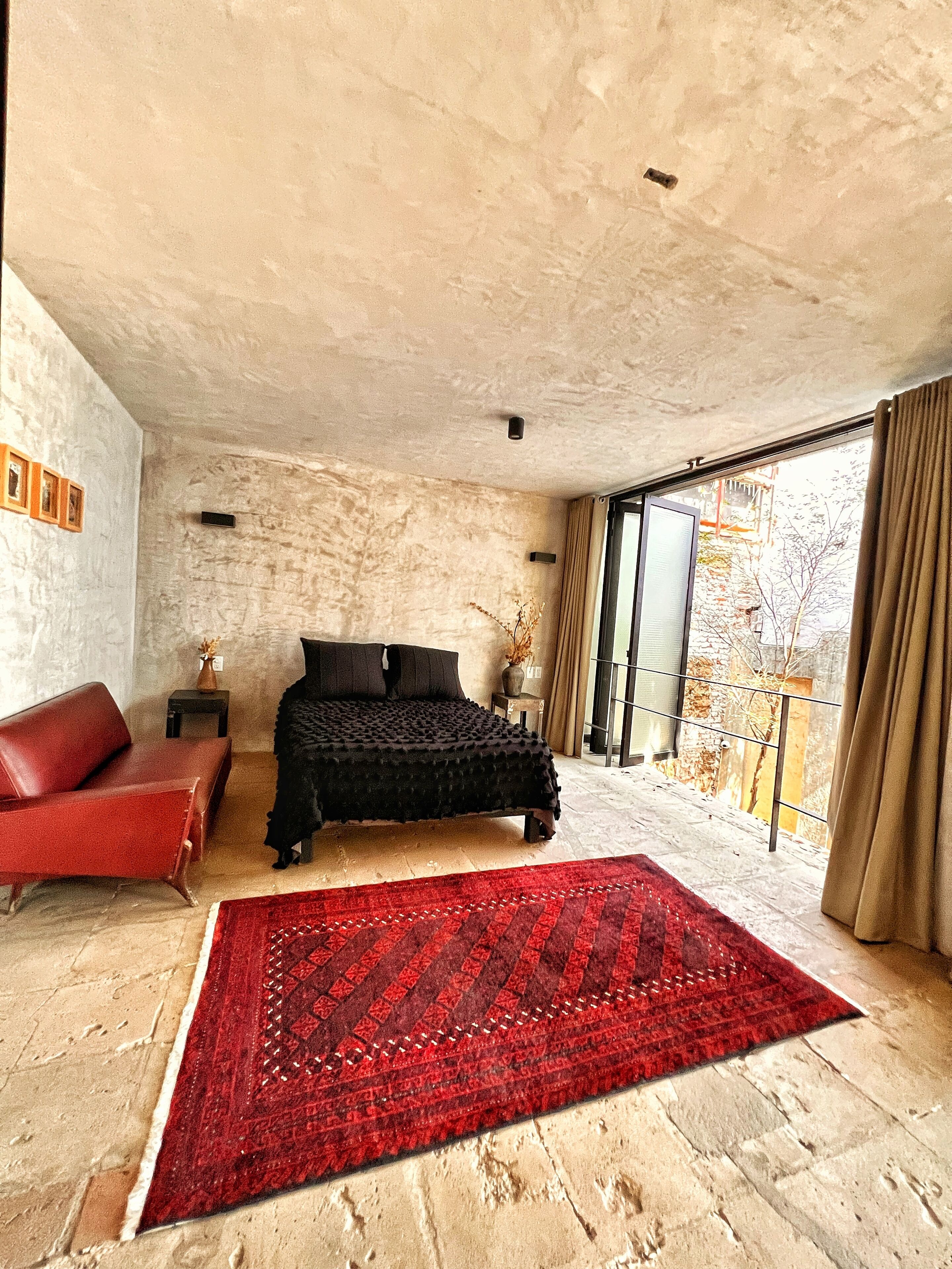 The room has a private entrance from a central patio.