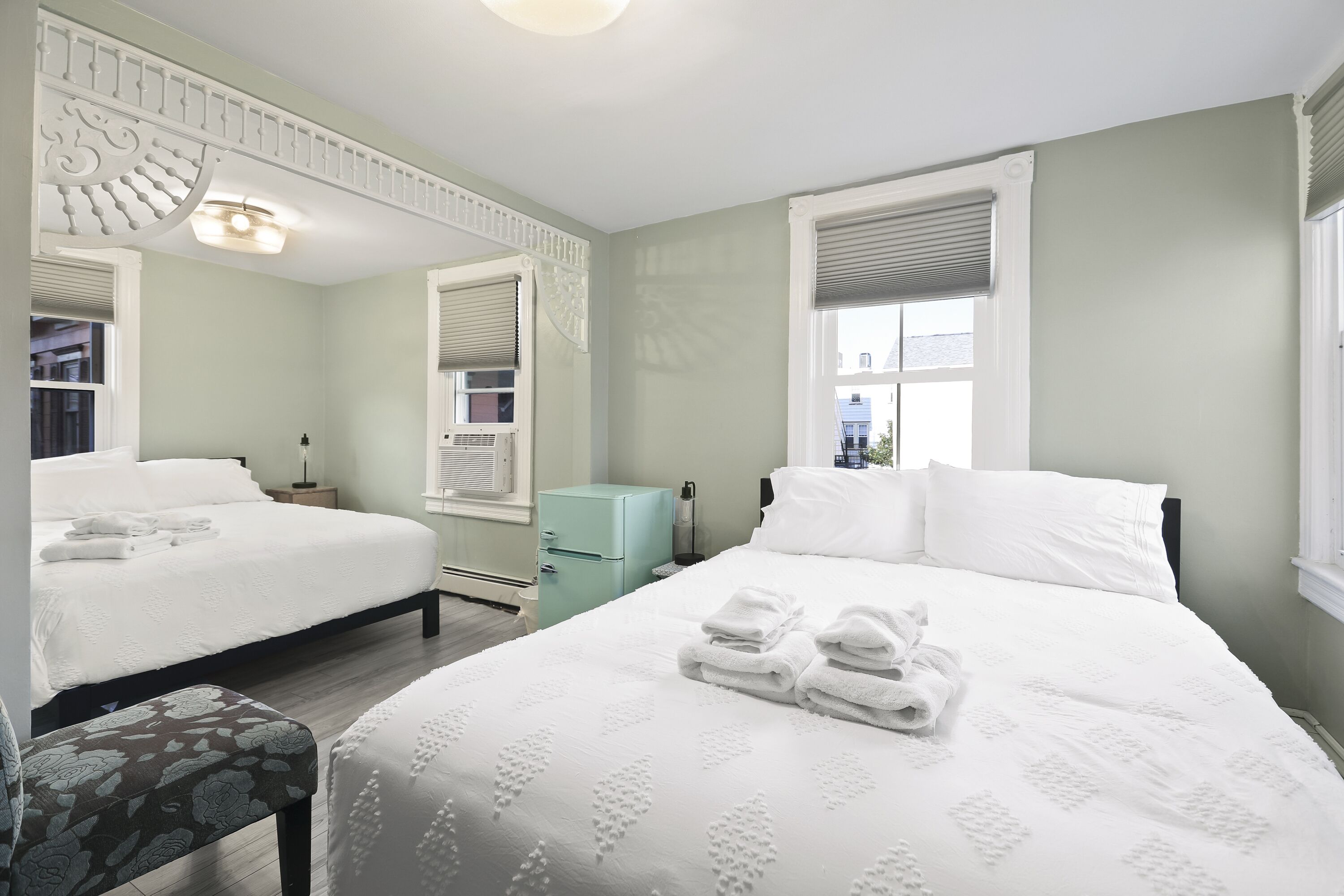 A lovely L-shaped, second floor room which has two queen-size beds plus the capacity for an extra cot. Fluffy white chenille spreads and lively floral prints complete the bright and cheerful aqua and white color scheme.