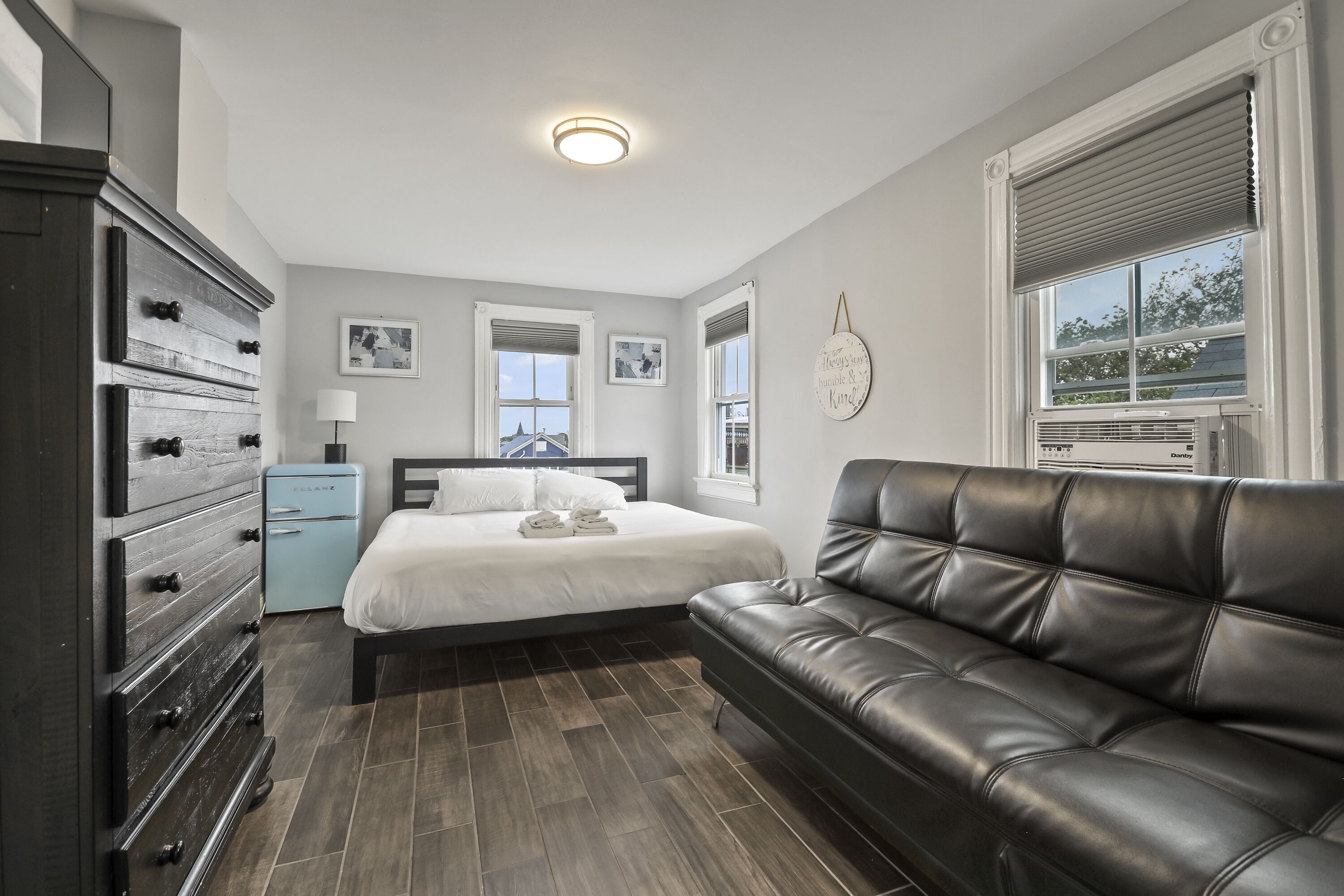 Features a queen size bed, and Full Futon fold down couch. Flat screen cable TV, Blue ray player, WiFi, full kitchen, AC, and private bathroom with tub and shower.