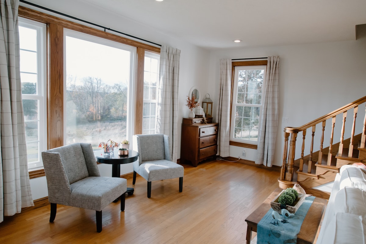 Welcome to Suite 1913 at Grinnell Mill, a historic retreat nestled in Glen Helen Nature Preserve. Step outside and hike scenic trails, waterfalls, and forests, or take a short walk to the vibrant town of Yellow Springs for unique shops and cafes. This cozy suite features two queen beds, private bath, and vintage charm, perfect for nature lovers and history buffs. Relax to the soothing sounds of the creek and enjoy the perfect mix of adventure and tranquility. Book your stay today!