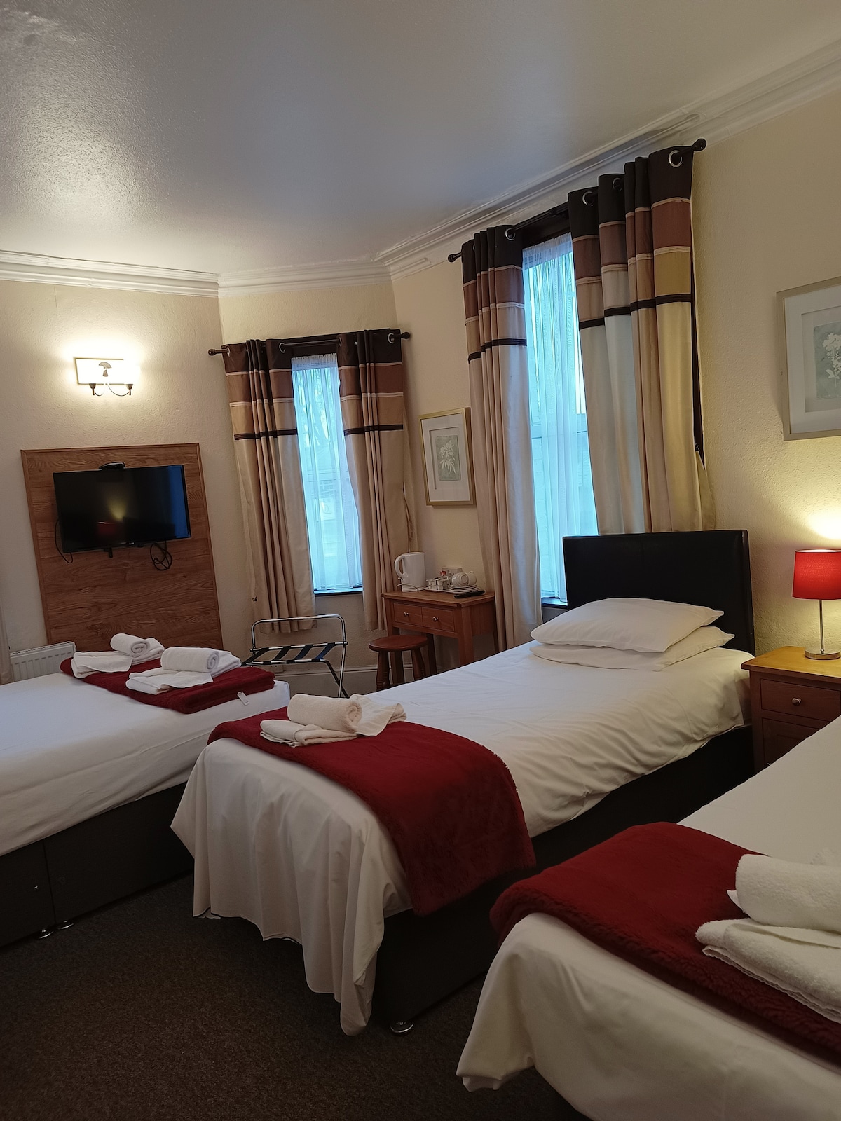 A family ensuite room decorated in the Cotswold style, with a double bed, two single beds. Facilities include wireless broadband Internet, complimentary hospitality tray with tea, coffee, chocolate, Horlicks & biscuits, fridge with UHT or fresh milk.