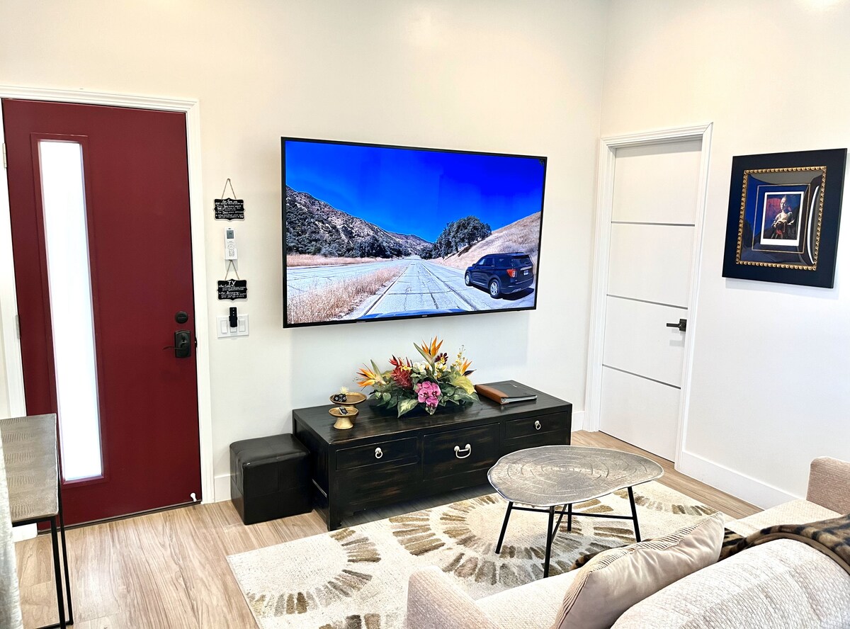 The property offers comfortable KING size bed and Living Room area with pull out sofa (linens provided). Curl up and watch your favorite shows on the 75" Smart TV.