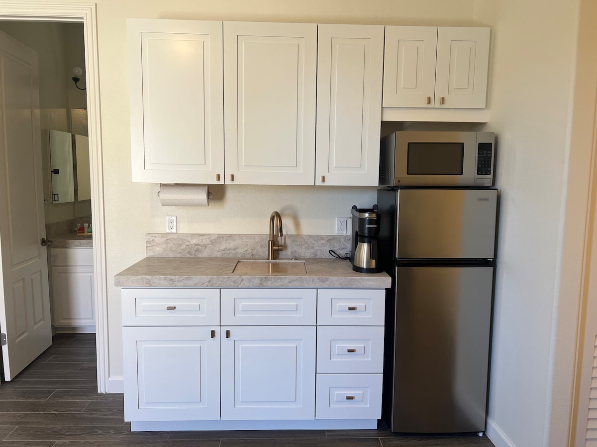 Your Own Full 10x13 Kitchen with Full Size Refrigerator with bottled water, Gas Stove, Microwave, Coffee Maker, Toaster, Blender and Bistro table for 2 ppl. Pots, Pans, Dishes and all supplies provided for your use.