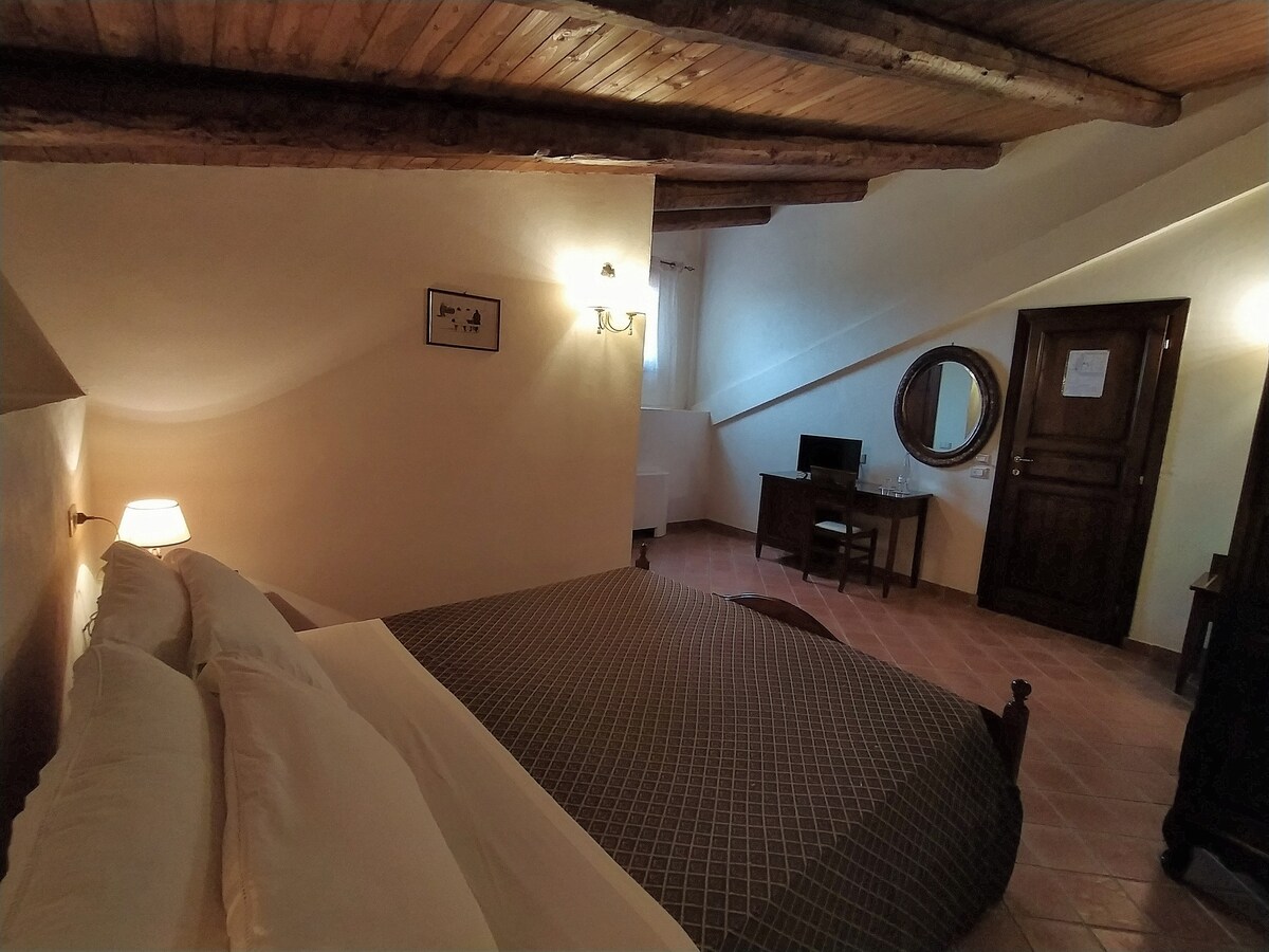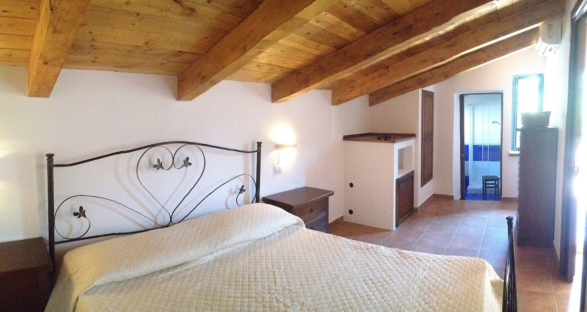 The mansard is a room set up as a double bedroom and is located on the first floor of the main villa, with an independent entrance. It stands out for the spaciousness of the rooms, which thanks to the location are more reserved and intimate, for the comfortable and well-finished bathroom, and for the possibility of accessing an external veranda of the villa overlooking the garden.