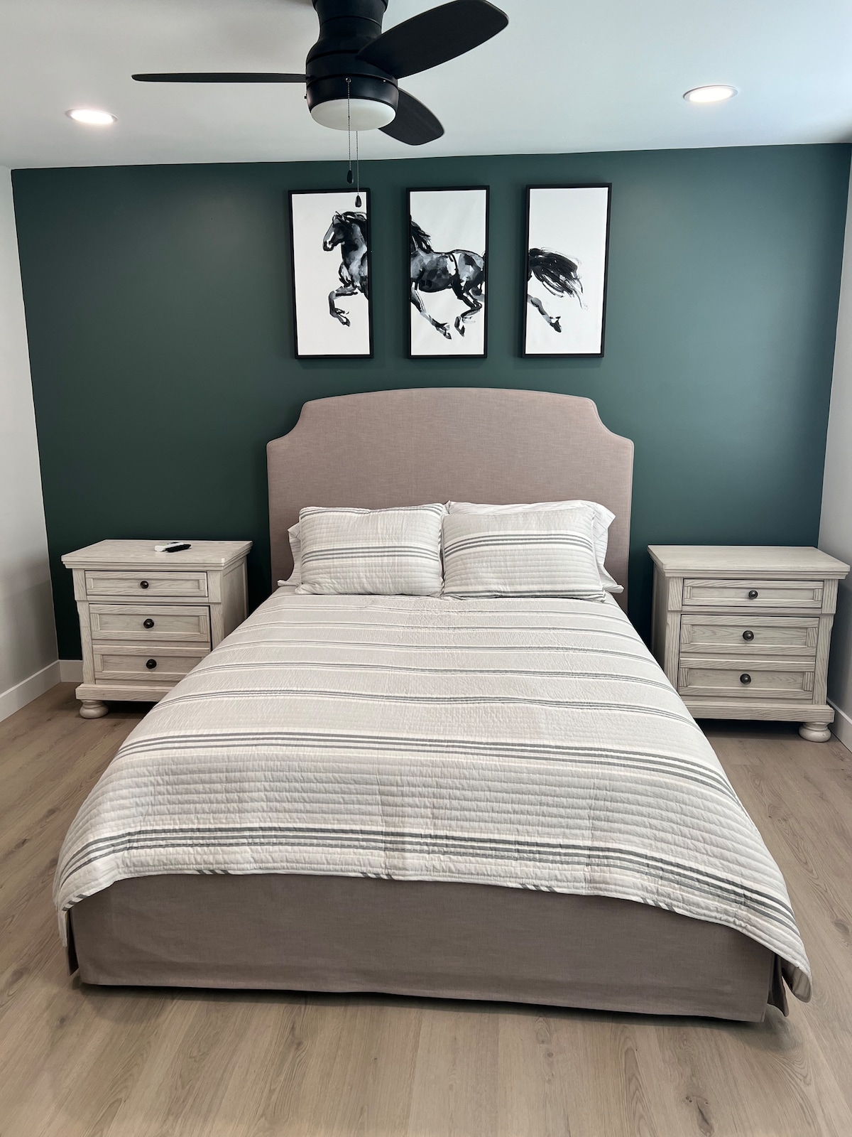 In the spacious master suite, guests will find everything they need for a comfortable stay. The room is furnished with a plush queen-size bed, perfect for a restful night’s sleep after a long day of exploring or working. Additionally, guests can relax in the cozy rocking chair with an ottoman, ideal for unwinding with a good book or simply taking in the serene atmosphere. For entertainment, a 32-inch TV is provided, complete with guest mode functionality, allowing guests to access their personal accounts for a customized viewing experience. The suite boasts a tranquil view of the backyard, providing a peaceful backdrop to your stay. With both tile flooring and a soft carpet, guests can enjoy the best of both worlds - the cool, refreshing feel of tile and the added comfort of carpeting. Ample storage space is available with three closets equipped with hangers, as well as a dresser for convenient organization of clothes and belongings. Whether you’re here for work or leisure, the master suite offers the perfect blend of comfort and functionality for your stay.