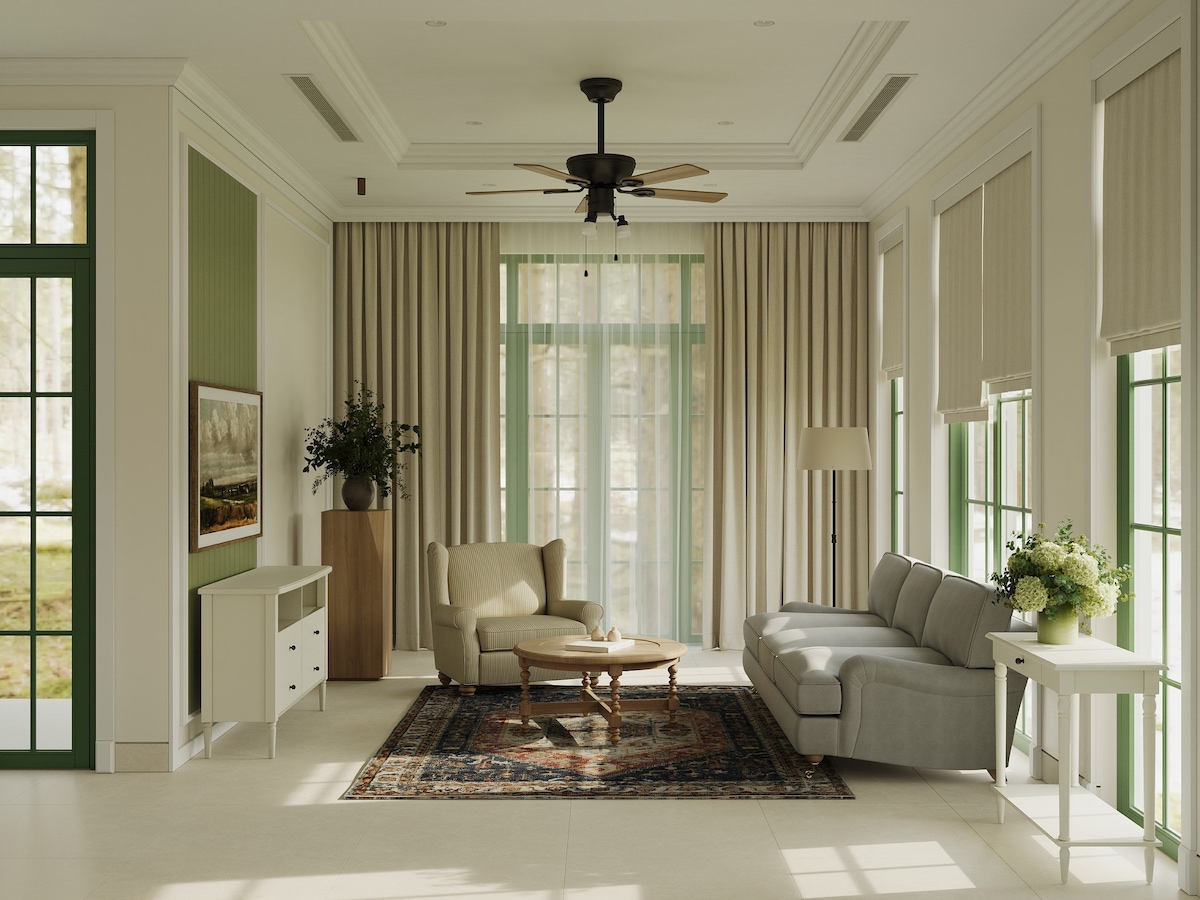 Elegant villa with sophisticated interior, spacious kitchen, dining room and cozy living room. A bedroom with soft lighting and a work area, perfect for relaxing. Modern furniture, stylish details, panoramic windows and natural shades create a cozy atmosphere. A great option for families and couples who value comfort, tranquility and aesthetics.