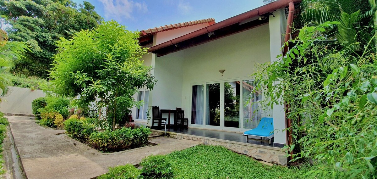 Serenity Garden is a 1000m² resort nestled amid Phu Quoc's lush meadows and mangrove forests. The main entrance features a spacious area for parking motorbikes or vehicles up to 30 seats. Upon entry, you'll find an open-concept lobby and restaurant with a breezy atmosphere, perfect for enjoying the fresh air. The resort's U-shaped layout includes two-story wings with a central pool area. Each room has its own external staircase and a balcony with seating, ideal for morning tea or coffee.