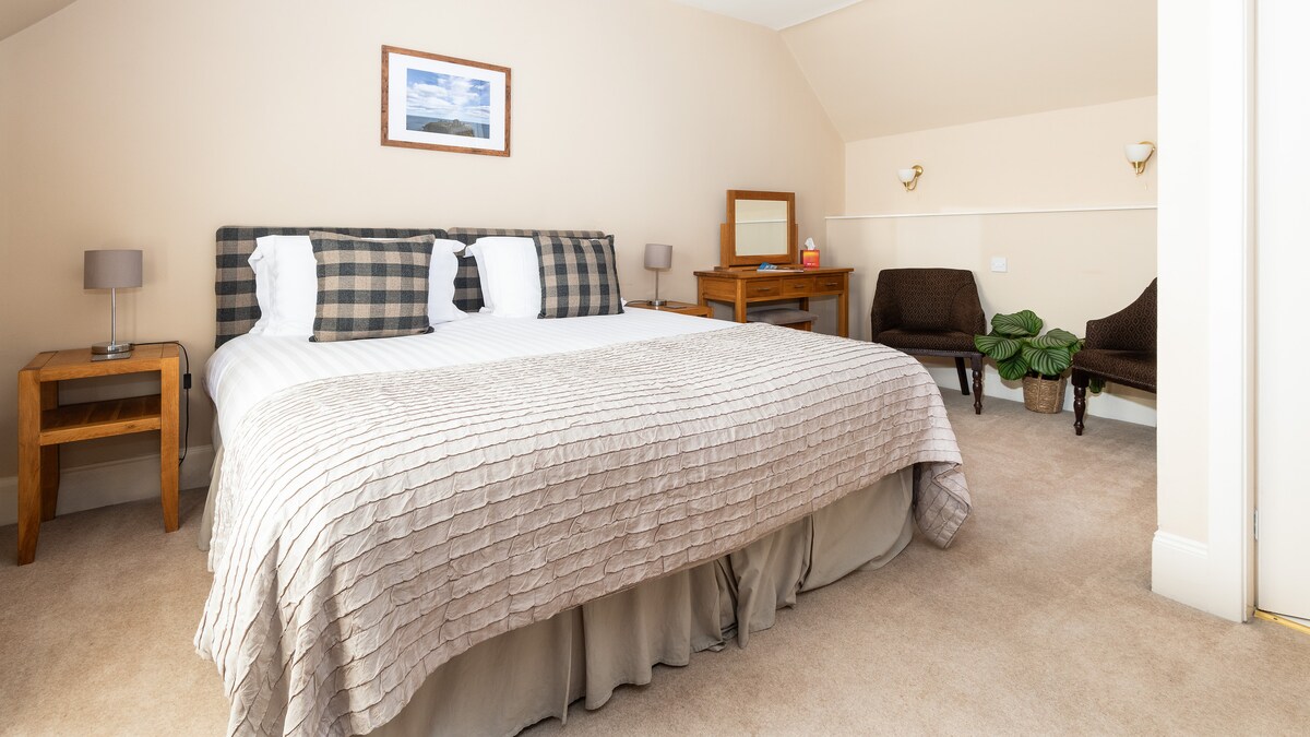 This comfortable upstairs double room has en-suite with shower over bath, tv and seating area. It also has a personal fridge in the hall that provides continental breakfast snacks to set you up for exploring the beautiful surroundings. Located near parking facilities.