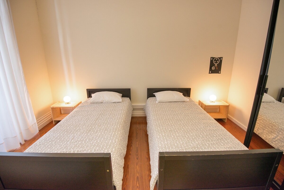 A room with capacity for two with twon single beds, TV, Wi-fi and a shared bathrrom with another room.