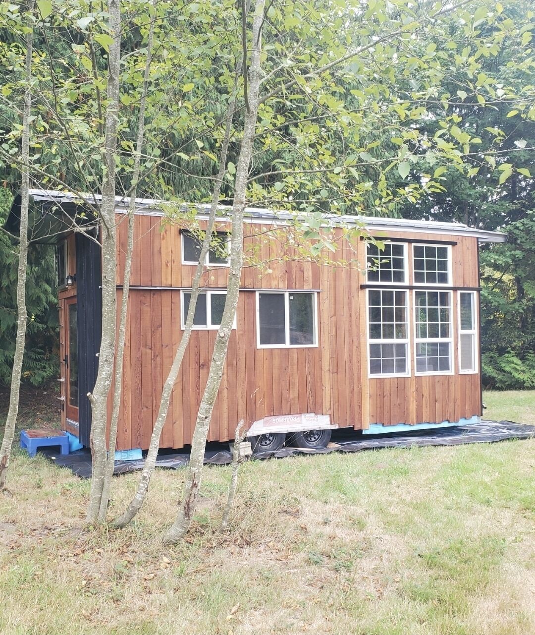 High end tiny home. Queen bed in loft with sink, storage, and fire escape! Double bed couch in living room with high ceilings, smart TV, and a huge bay of windows to expose serene views of pasture, and French doors to reveal Ewok style - gorgeous forests. Kitchen has double stove and separate oven, pour over coffee carafe with grinder, dorm size fridge, air fryer, and cutlery basics. Bath is equipped with a full-size shower, sink, and 'airhead' high efficiency, ultra-modern, odor free composting toilet.