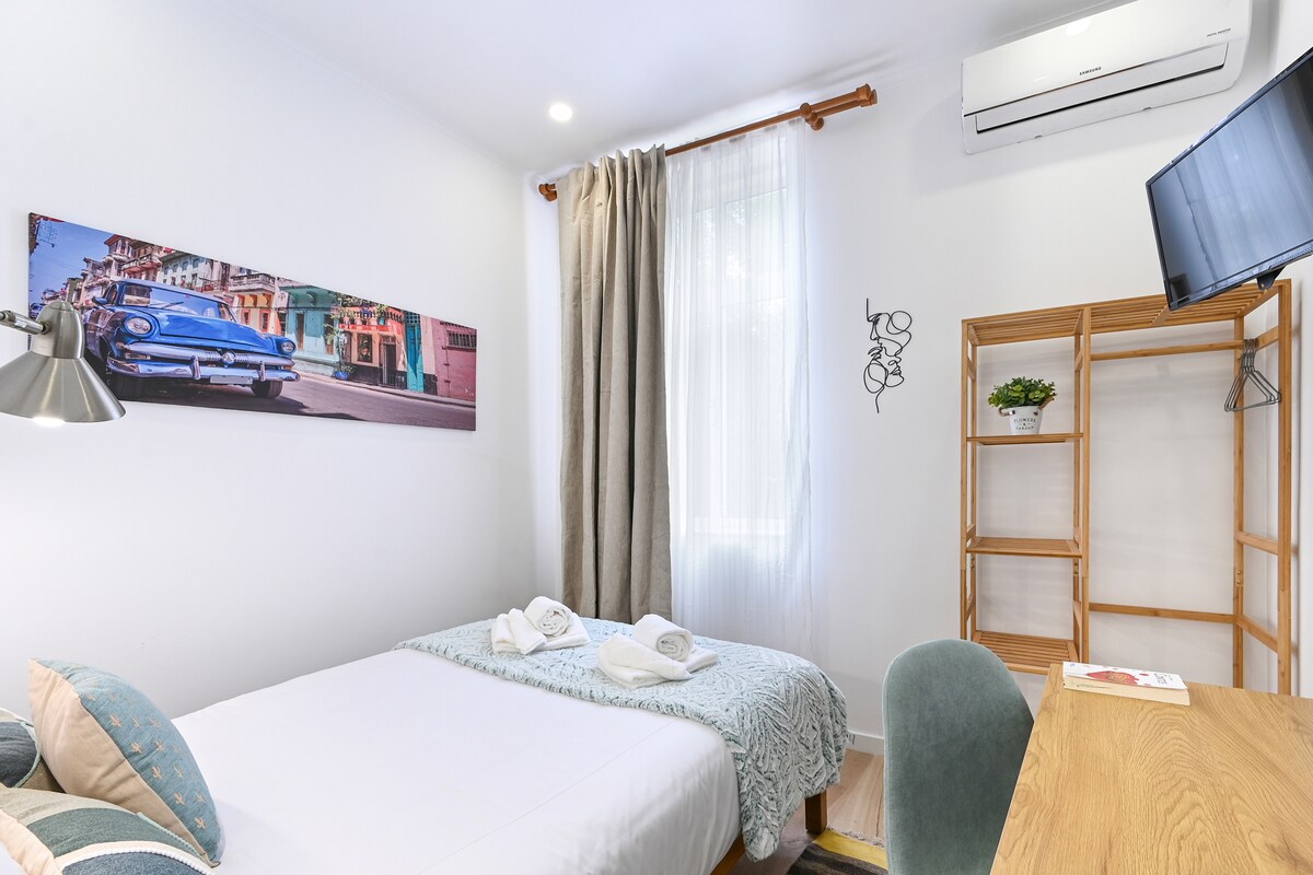 Room 13 is located in Casa Maya, which is an accommodation establishment with 8 individual rooms, all with private bathrooms. The building has 4 floors, also featuring a common kitchen, a dining room and an outdoor patio to relax, located on floor 0. The building is located at 50 meters from the Faria Guimarães metro station. The bedroom has a double bed, TV, Wi-Fi, air conditioning and private bathroom. This room is located on the floor 1 (entrance floor).