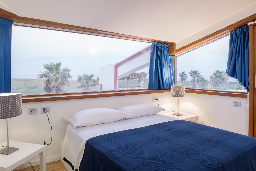 A double bedroom surrounded by windows with a stunning panoramic view. Located on the first floor of the Villa, it enjoys the silence of the countryside and the sunset over the sea.