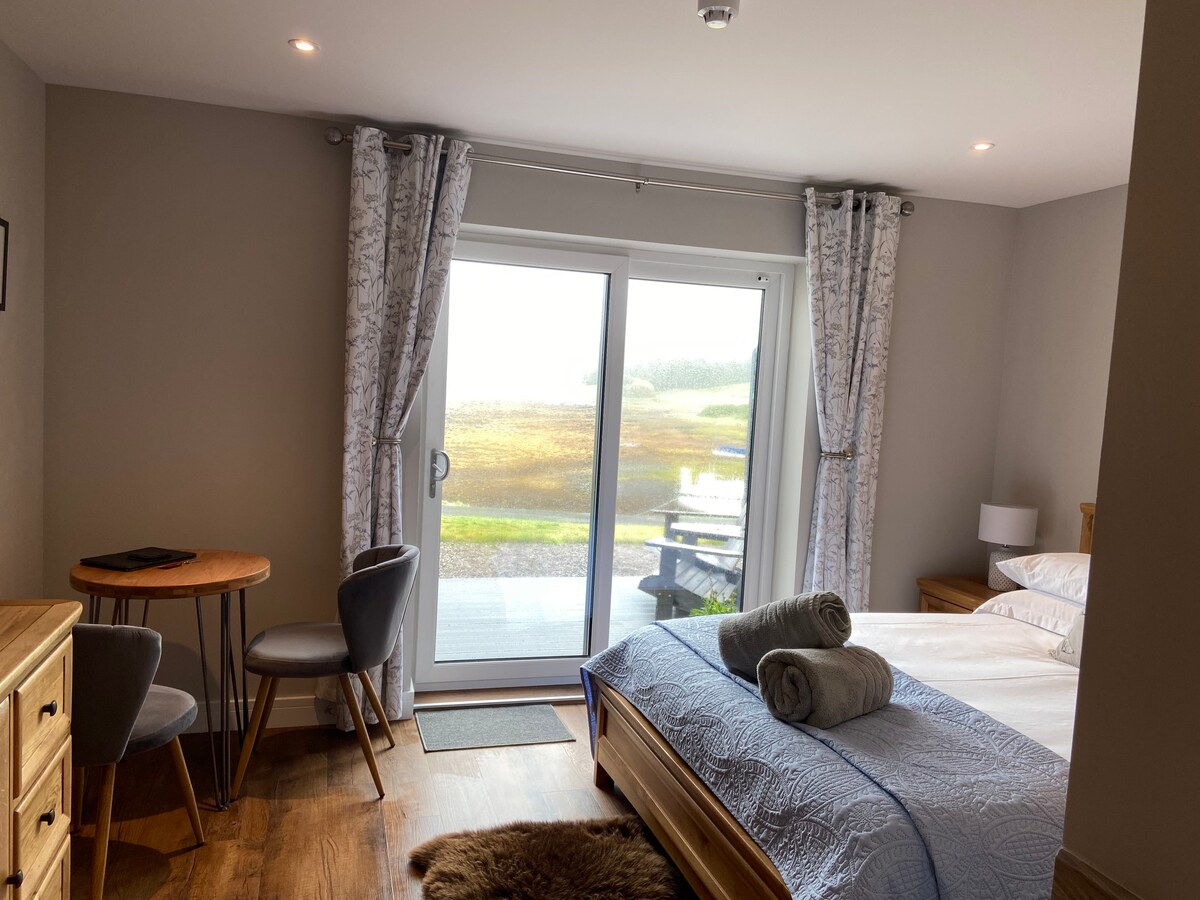 Comfortable, freshly decorated King Room(Room Only, No Breakfast) with underfloor heating situated 8 minutes drive from Portree and within our family home with private entrance, decking and spectacular views of Loch Portree and The Storr, and where you can also spot lots of wild life… and sheep! It also boasts a modern en-suite with large waterfall power shower. Although we do not provide breakfast, we will provide a complimentary tea tray, and the room also has a microwave, kettle, toaster, coffee machine and fridge(No kitchen sink).