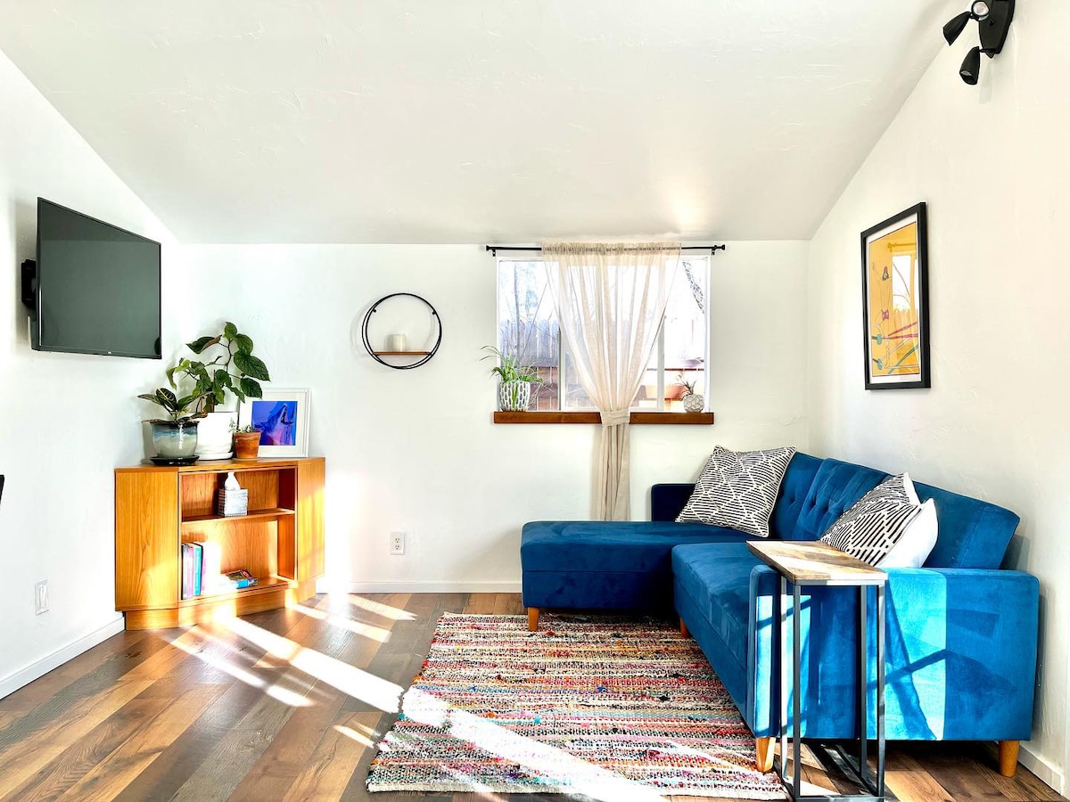 The Casita is a separate guest house situated behind our main home. It is set back from the street and includes its own parking and outdoor space. This is a one bedroom with a master bath, a kitchenette, and laundry in the unit. There is a fold out couch in the living room which can sleep 1. The kitchen/dining/living room space is one large, open concept room. You will share the space with happy house plants and eclectic art. This is a pet friendly rental.
