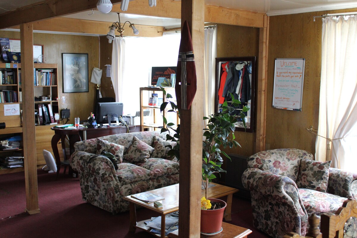 Located near Torres del Paine National Park, we offer comfort and a cozy atmosphere. Includes buffet breakfast, free Wi-Fi, heating, and towels. Enjoy a full kitchen, climbing wall, and more. We also rent camping gear and offer excursions. We also have laundry service and free storage. Ideal for your adventures in Patagonia. We look forward to seeing you.