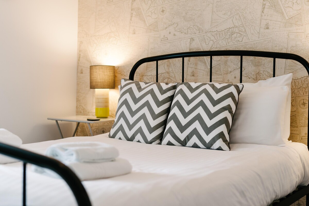 This room has a luxury king size copper bed, set against a lovingly restored panelled wall (recently discovered during renovations). The bathroom has a bluetooth mirror, enabling you to listen to your favourite music as you soak in the bath. A smart TV and a Tassimo coffee maker are also provided.