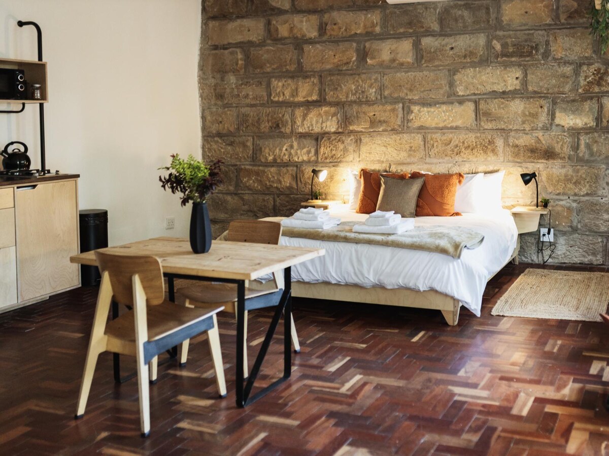 The Room has a king-size bed and an en-suite bathroom with a shower and freestanding bath. The room is equipped with a kitchenette, small dining table, a lounge area and private patio. Cuddle up next to the stone fireplace.