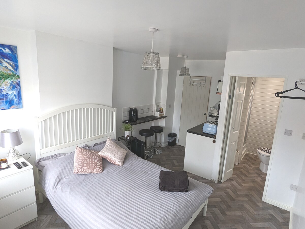 The main room is a large open plan living space including a lounge area, dining area, dedicated work space and fully eqipped kitchen including hobs, oven and refrigerator. The lounge area has a large TV with freeview. The sofa turns into a comfortable double bed to accomodate any extra guests. At the back is a bedroom with king size bed, dressing table and wardrobe (with space for garments to be stored/hung). There is a bathroom with a stand alone shower.
