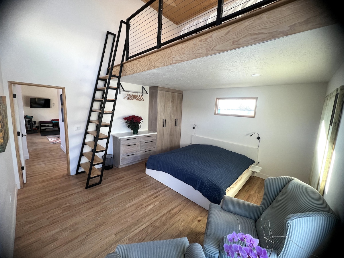 Enter through your separate entrance into a common area featuring a fully stocked kitchenette (incl fridge, sink and induction stove top) and dining area. To your left, enjoy a full workout area with yoga/workout mats, weights and a Peloton bike. Proceed to your right through a small hallway to the full bath on your left and continue straight into the master bedroom with a king size bed. A ladder leads to a loft featuring a desk and queen size bed.