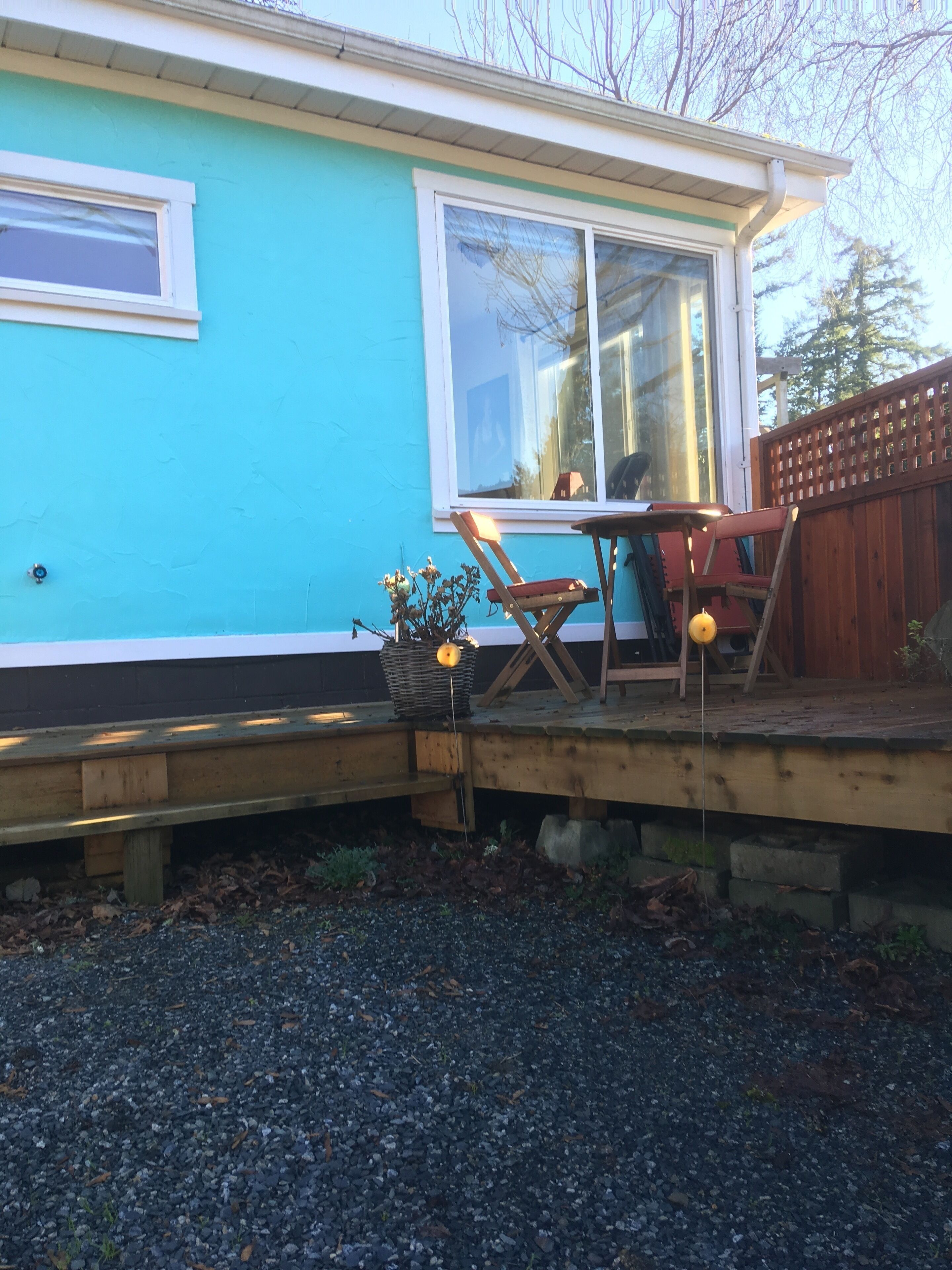 • 800 sqft indoors, with a large covered deck with outdoor table and BBQ (patio French doors open to extend the living room, creating an indoor/outdoor space).