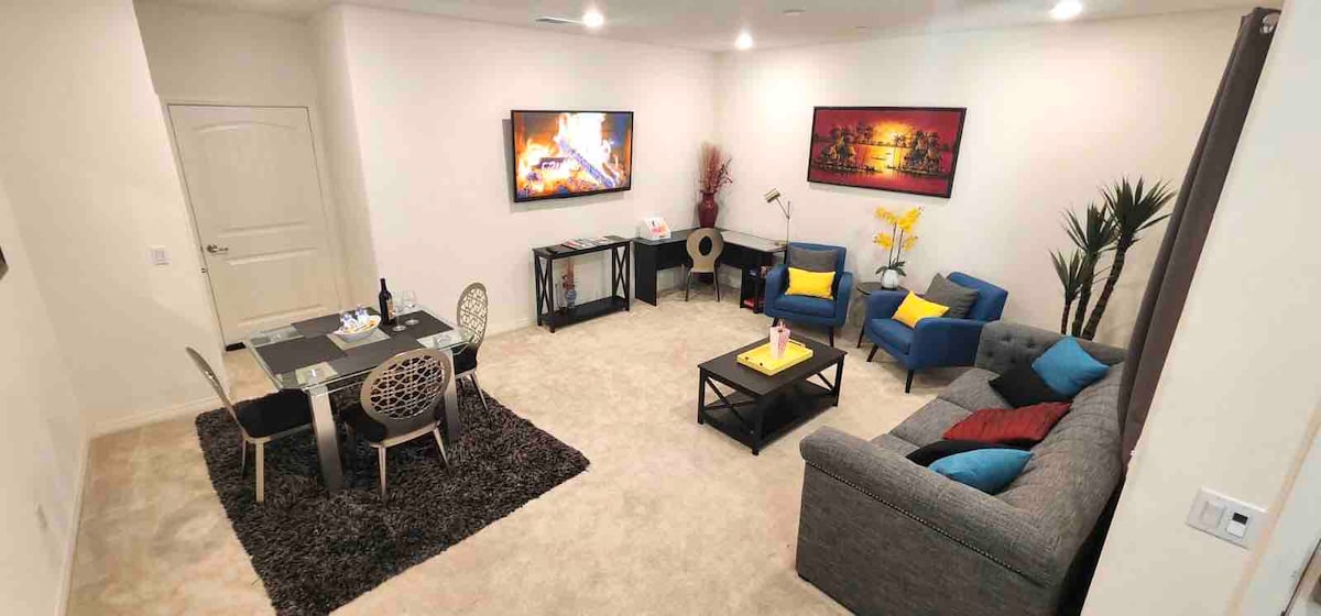 Comfy suite for So CA Travel RN/traveling, professional couple. Pet friendly up to 15 lbs. Central to 210/10/15/60 Freeways, and close enough to take call at over 10 large, local hospitals (ARMC, SBMC, Kaiser Fontana, San Antonio Regional, etc). Kitchenette with dishwasher and fridge, blackout curtains in a separate bedroom, smart TV in each room, small appliances galore, your own washer and dryer, high speed WiFi, close to local parks and Victoria Gardens Shopping Center, plus tons of hiking.