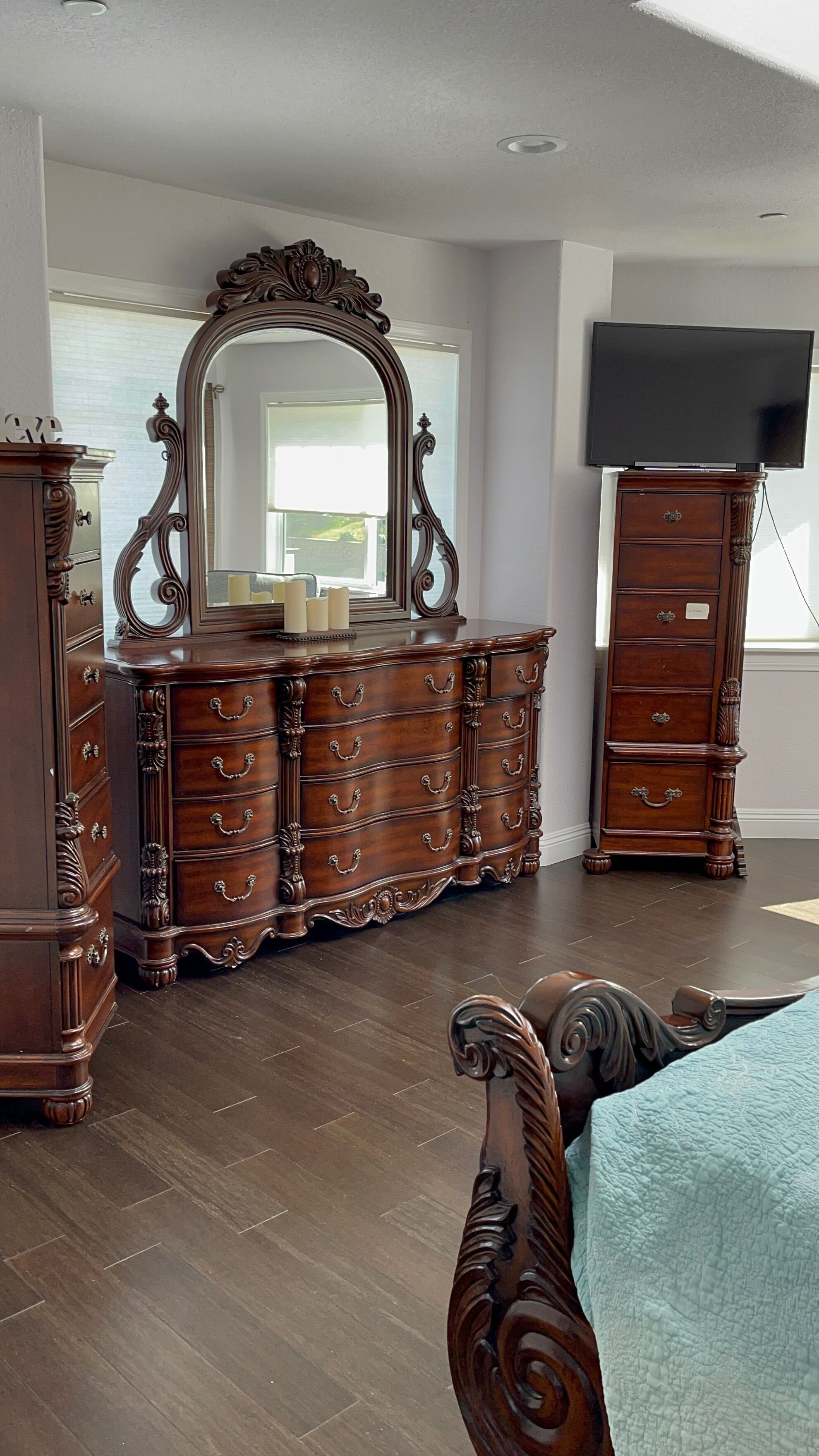 (2) nightstands with (2) night lamp, (2) basket storages for clothing underneath bed, bathroom mirror with different light settings & defroster. Access to pool and backyard setting area with exterior lights arround gazebo. Plywood flooring in kitchen and restroom area.