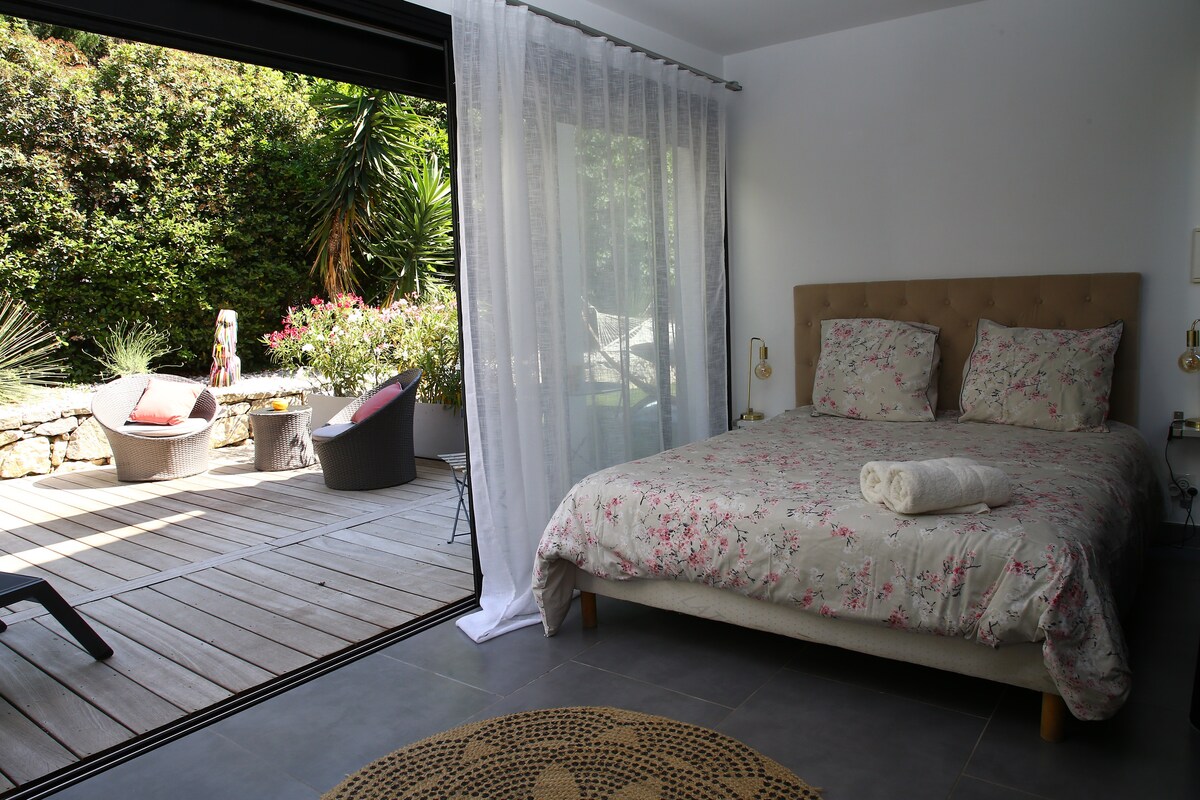 Let yourself be seduced by this lovely place to stay. This room is equipped with a large terrace with private spa, deckchair and private garden furniture.