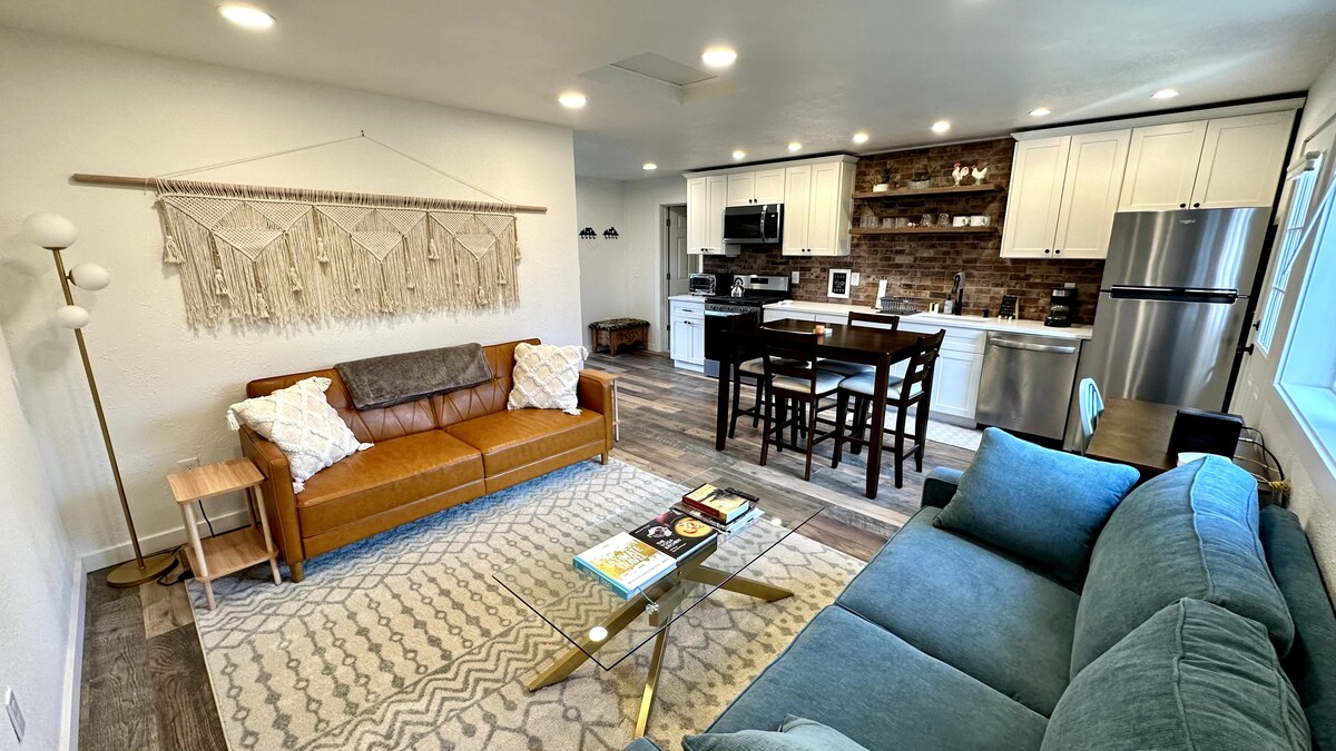 Rest easy in the queen bed, pull out sofa bed or futon couch. Use the luggage racks to stay organized and tidy. The large kitchen is fully stocked for all your cooking needs and we provide coffee and tea. Freshen up in a tiled shower with a relaxing waterfall shower head. Clean your laundry with a washer/dryer and we provide detergent. Utilize the private backyard with a BBQ and seating area.