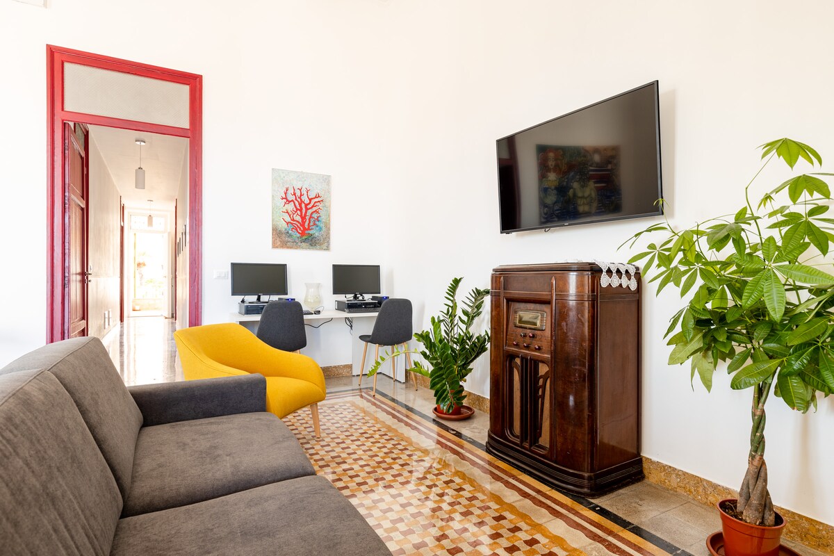 In the living room on the ground floor, used as a breakfast room, you will find two PC stations for your needs. You can also enjoy breakfast outside on the large terrace. The location is ideal for visiting nearby Bagheria, with the famous Palagonia and Cattolica Villas, and Santa Flavia train station just 500 meters from the property connects you to Palermo (15 minutes by train) and Cefalù (50 minutes by train).