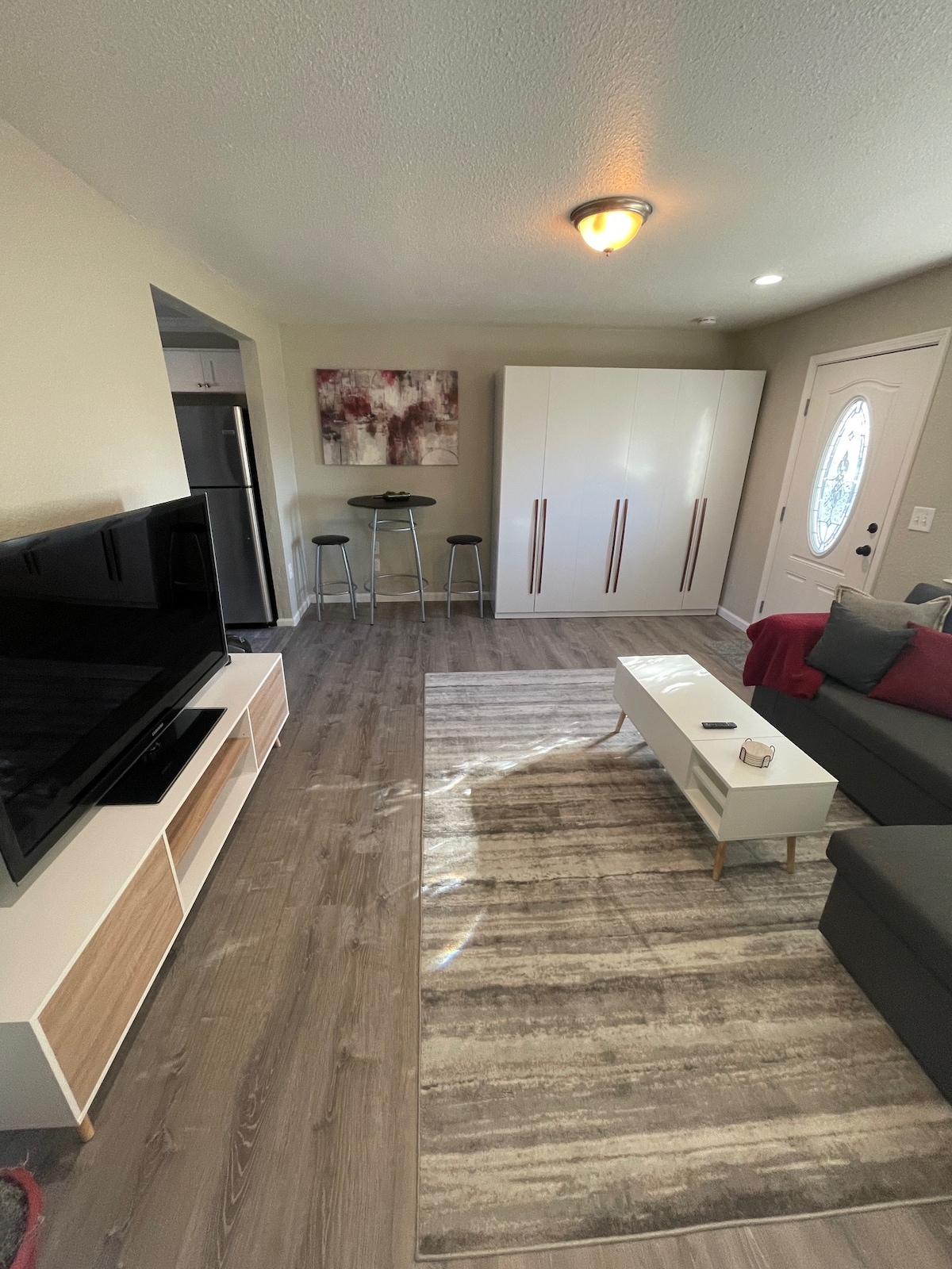 In the 167 square foot studio you will find a very comfortable queen size bed. Bedsheets and pillows are provided during your stay. Nightstand has a built in outlet to plug in small appliances next to the bed. There is a dresser with plenty of drawers to store your things. There is also a drawer under the bed for any additional storage.